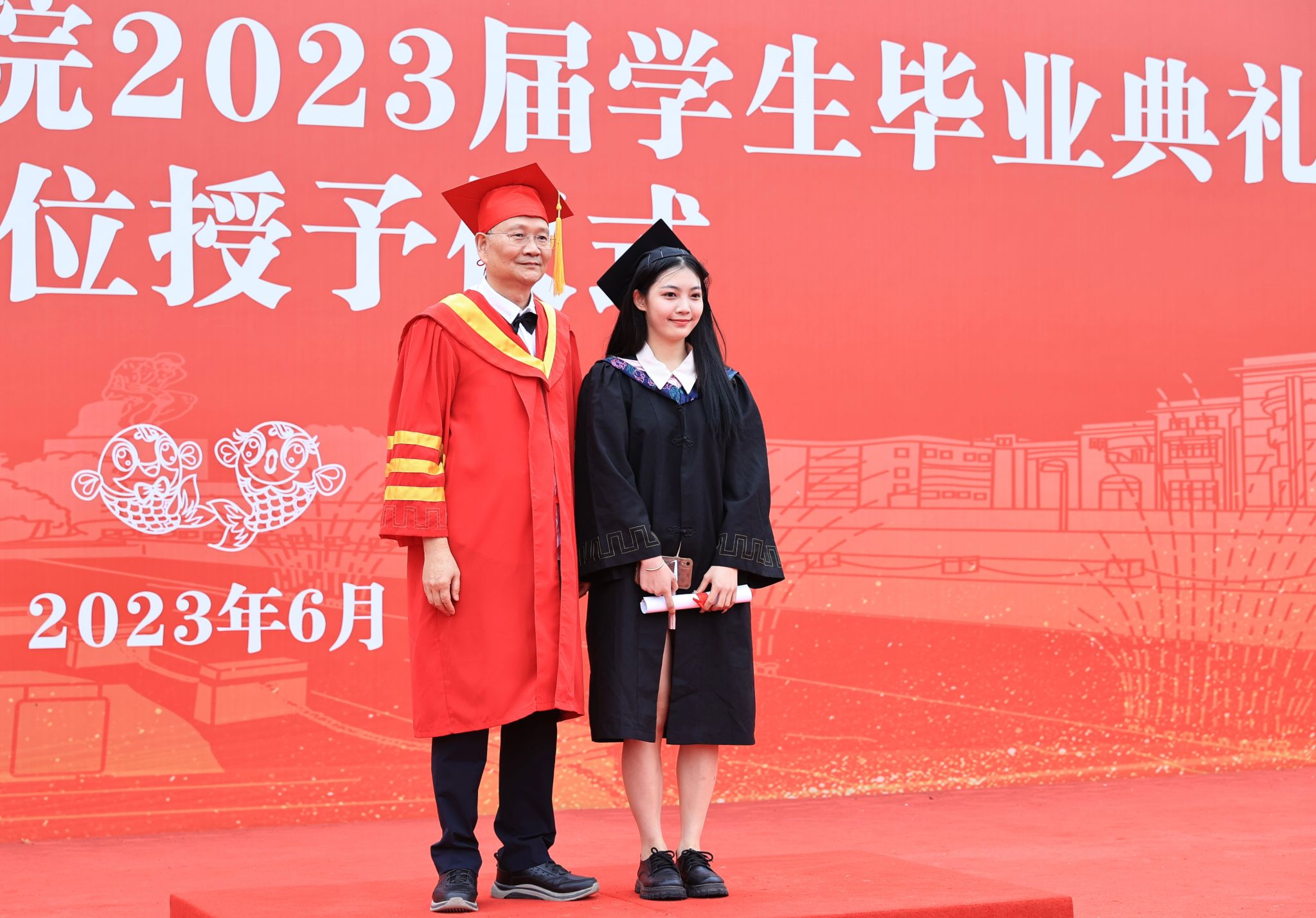 在学位仪式授予环节,身着学士服的毕业生依次上台。校长吴永桥和各学院院长为毕业生们拨穗正冠,合影留念。随着最后一名毕业生代表的拨穗礼结束,2023届毕业典礼暨学位授予仪式圆满落幕。