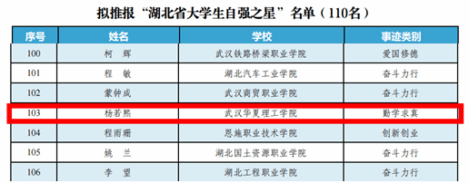 7月4日,湖北省2022年度“大学生自强之星”评审结果公示期结束,我校杨若熙同学荣获“湖北省大学生自强之星”称号。