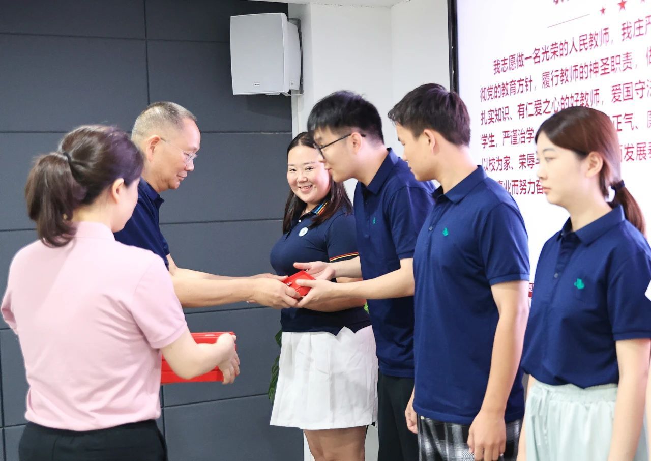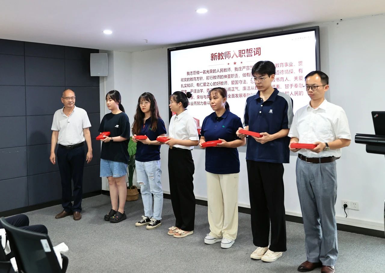 校长吴永桥、党委书记丁德智、副校长丁成忠分别为新入职教师代表颁发校徽。
