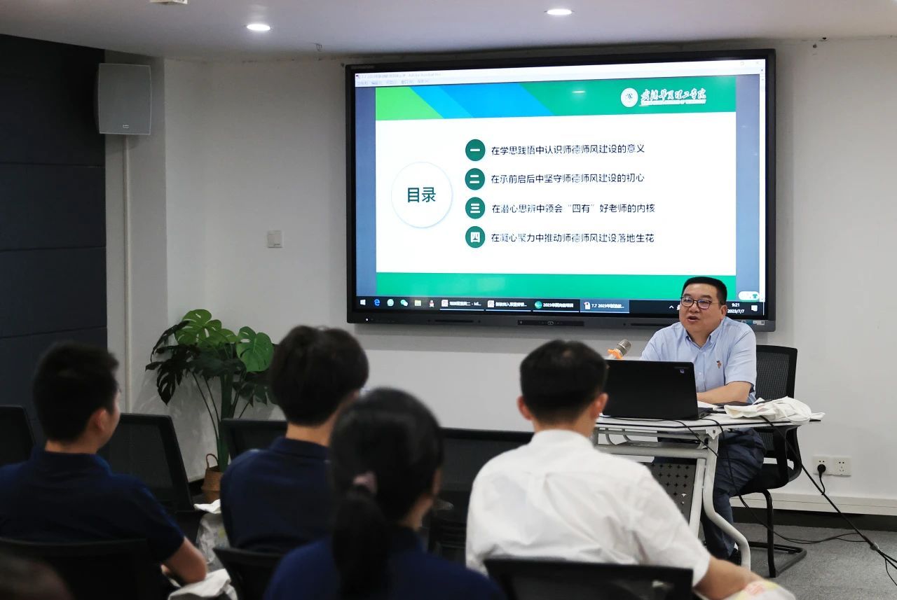 丁德智为新入职教师作题为《牢记初心使命 争做青年的“大先生”》师德师风专题报告。他以习近平总书记的系列讲话为参照,深刻分析了在新时代、新征程的当下,我们党对于高校建设以及教师师德师风的重视。他强调,各位老师要在学思践悟中认识师德师风建设的意义,在承前启后中坚守师德师风建设的初心,在潜心思辨中领会“四有”好老师的内核,在凝心聚力中推动师德师风建设落地生花。
