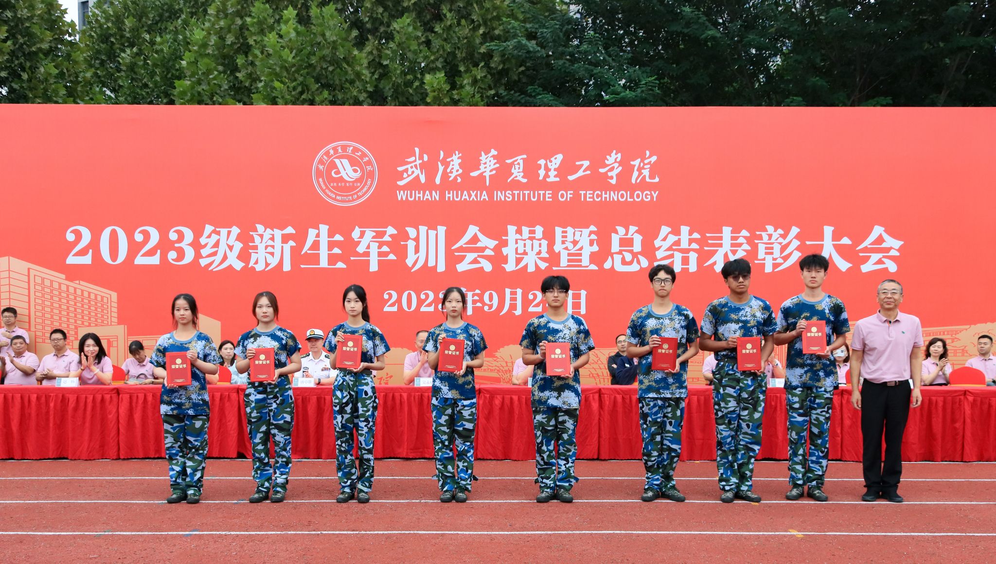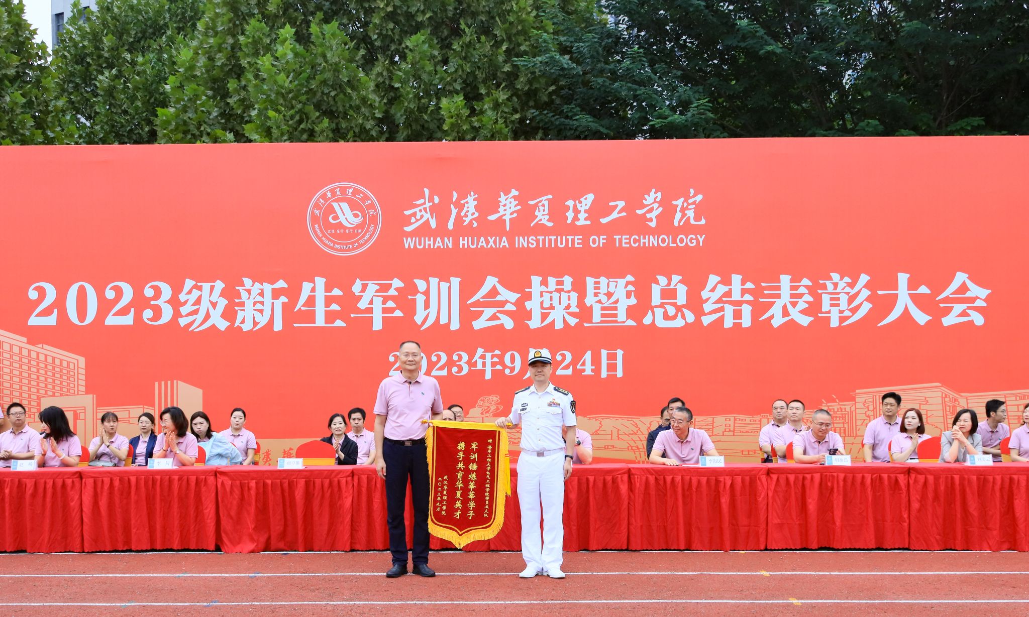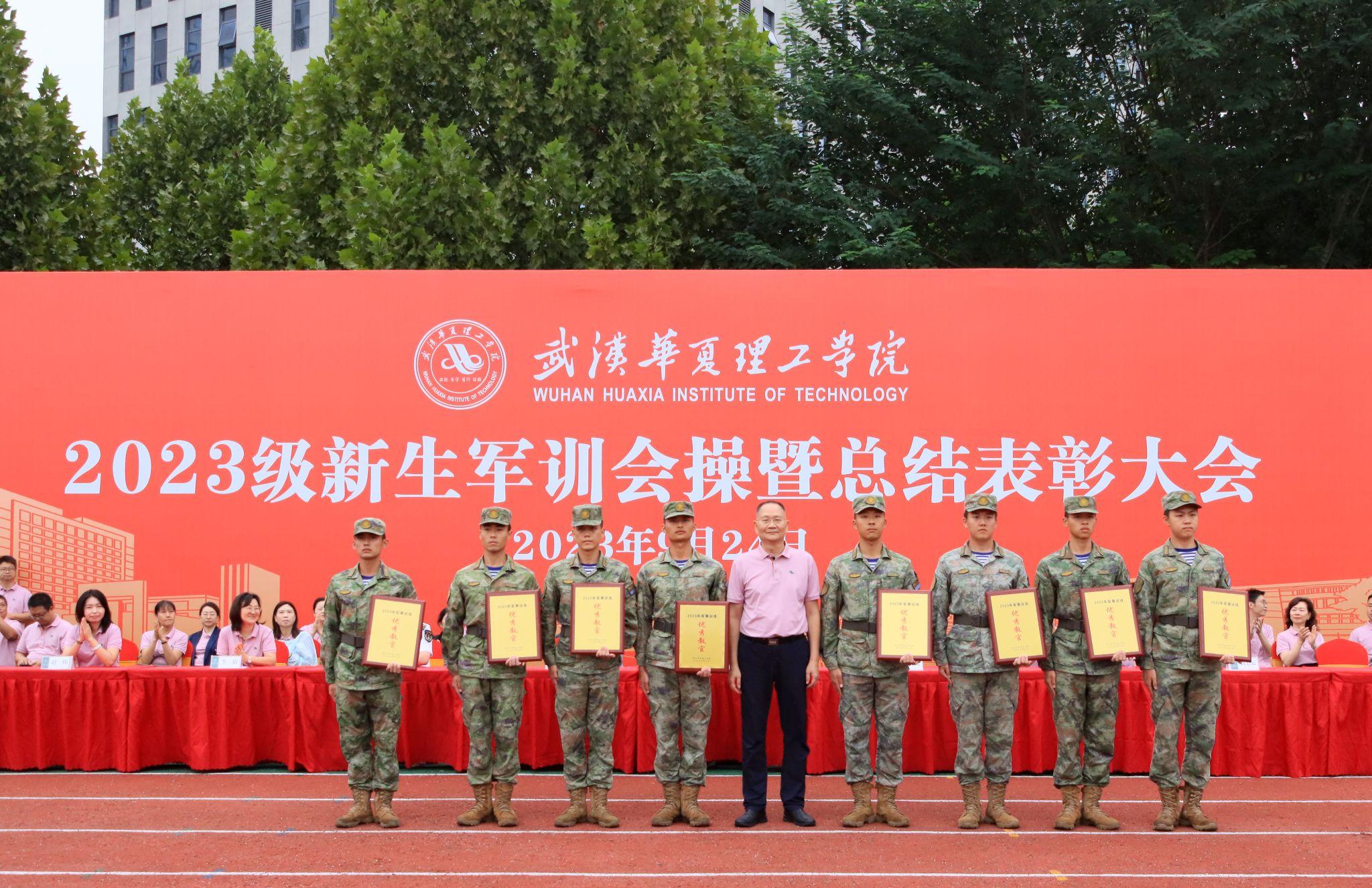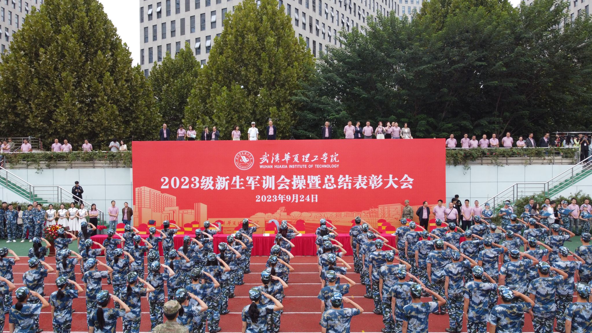 9月24日上午,我校2023级新生军训会操暨总结表彰大会在田径场举行。全体校领导,承训部队领导,各学院、职能部门负责人,教师代表以及全体2023级新生出席大会。大会由副校长丁成忠主持。
