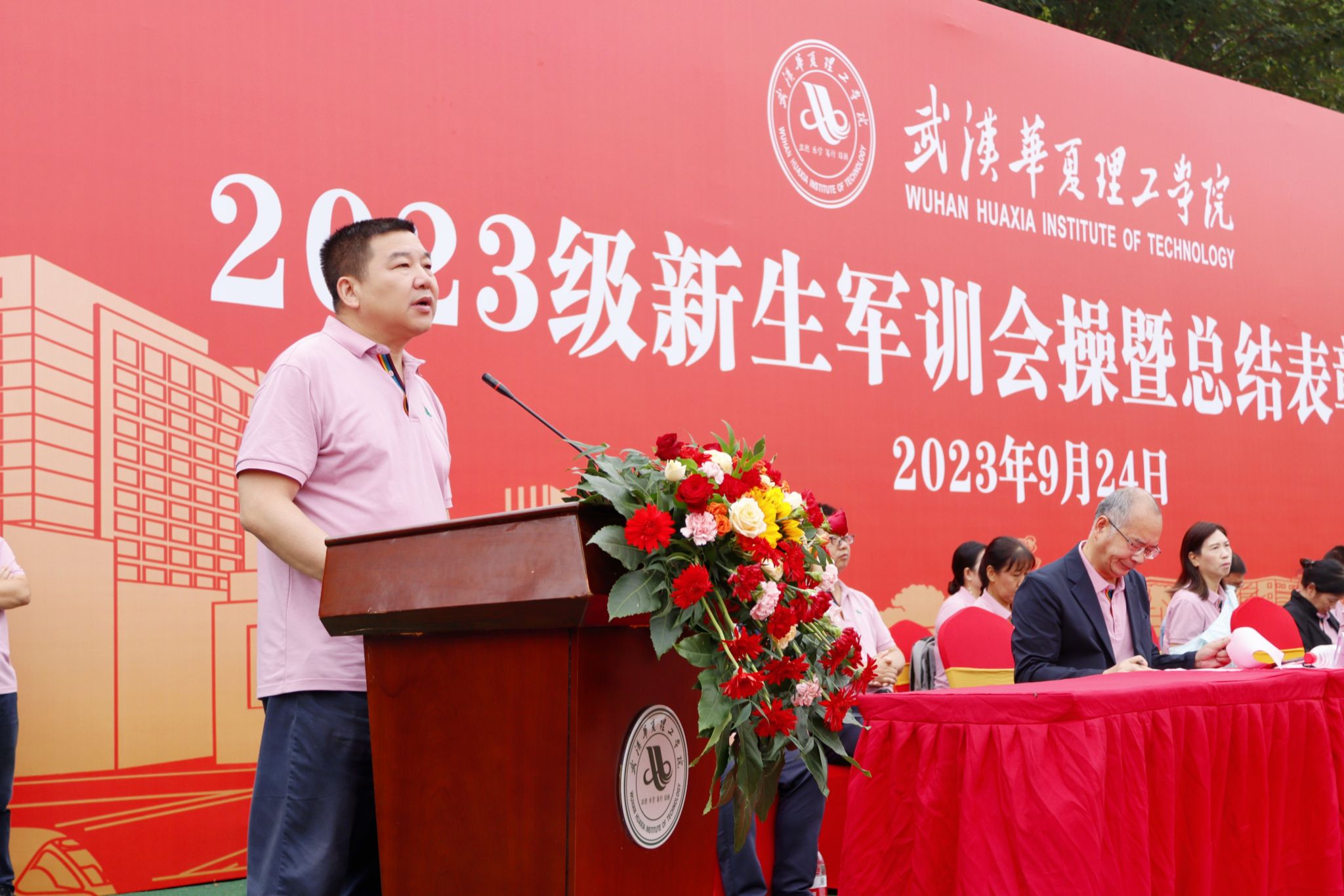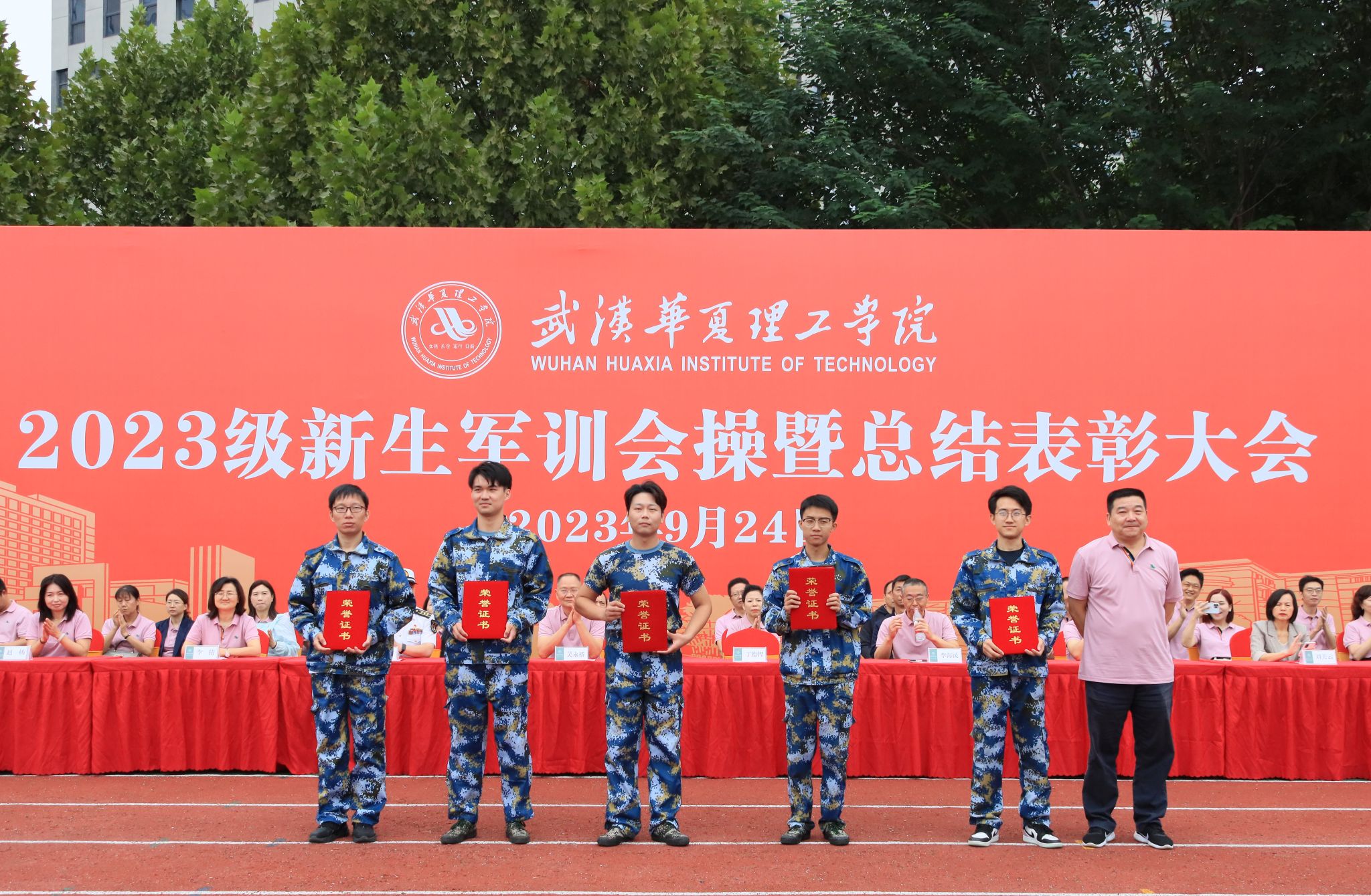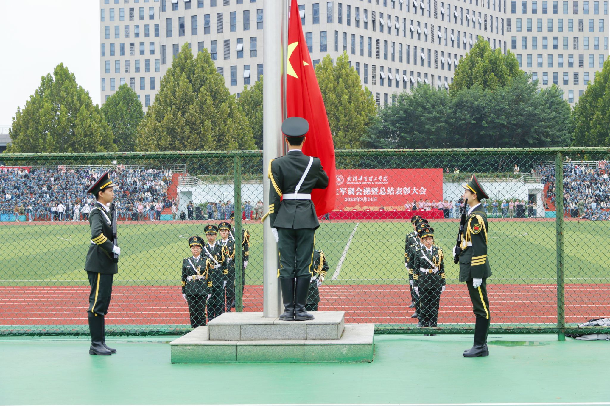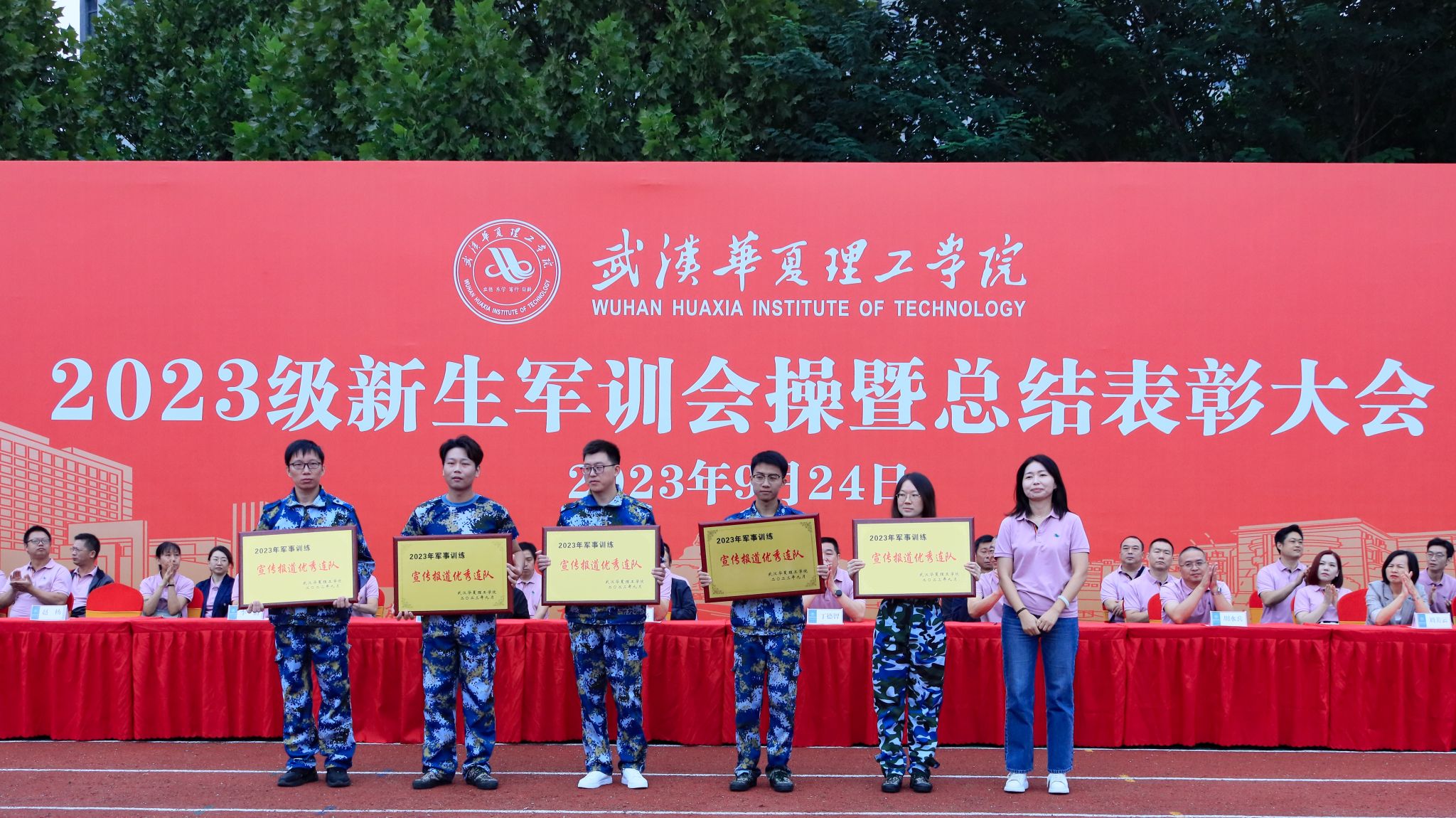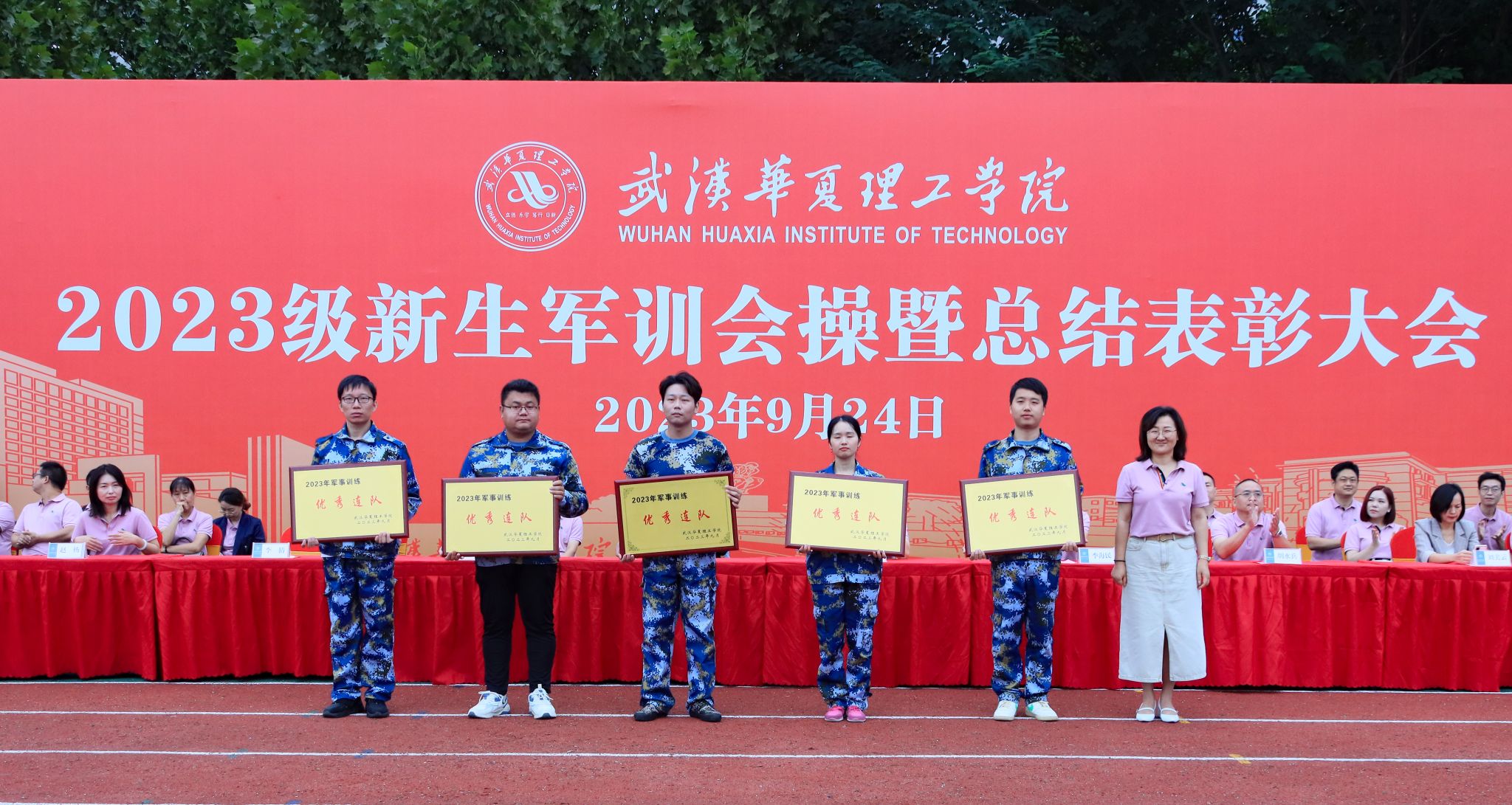 9月24日上午,我校2023级新生军训会操暨总结表彰大会在田径场举行。全体校领导,承训部队领导,各学院、职能部门负责人,教师代表以及全体2023级新生出席大会。大会由副校长丁成忠主持。