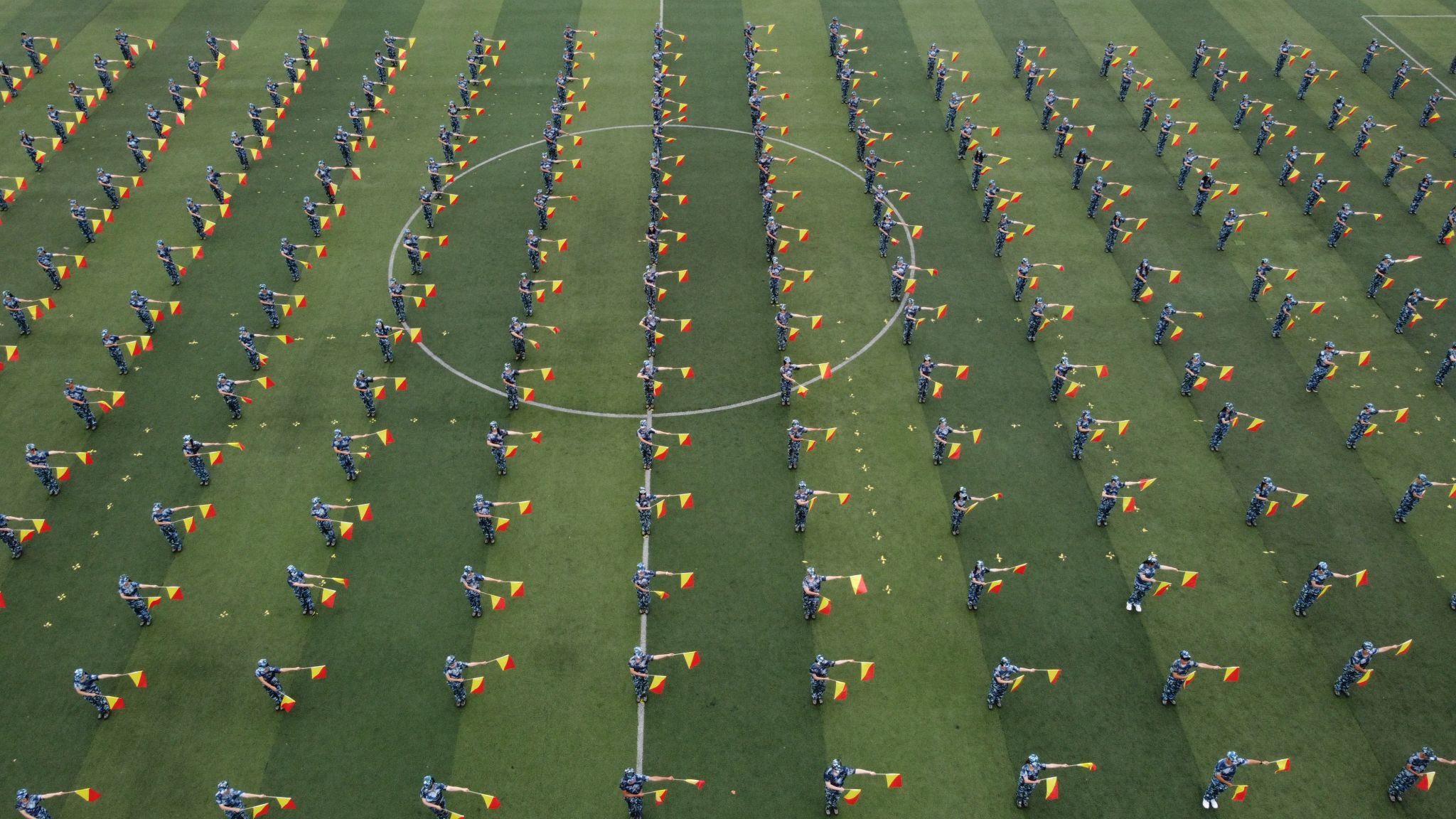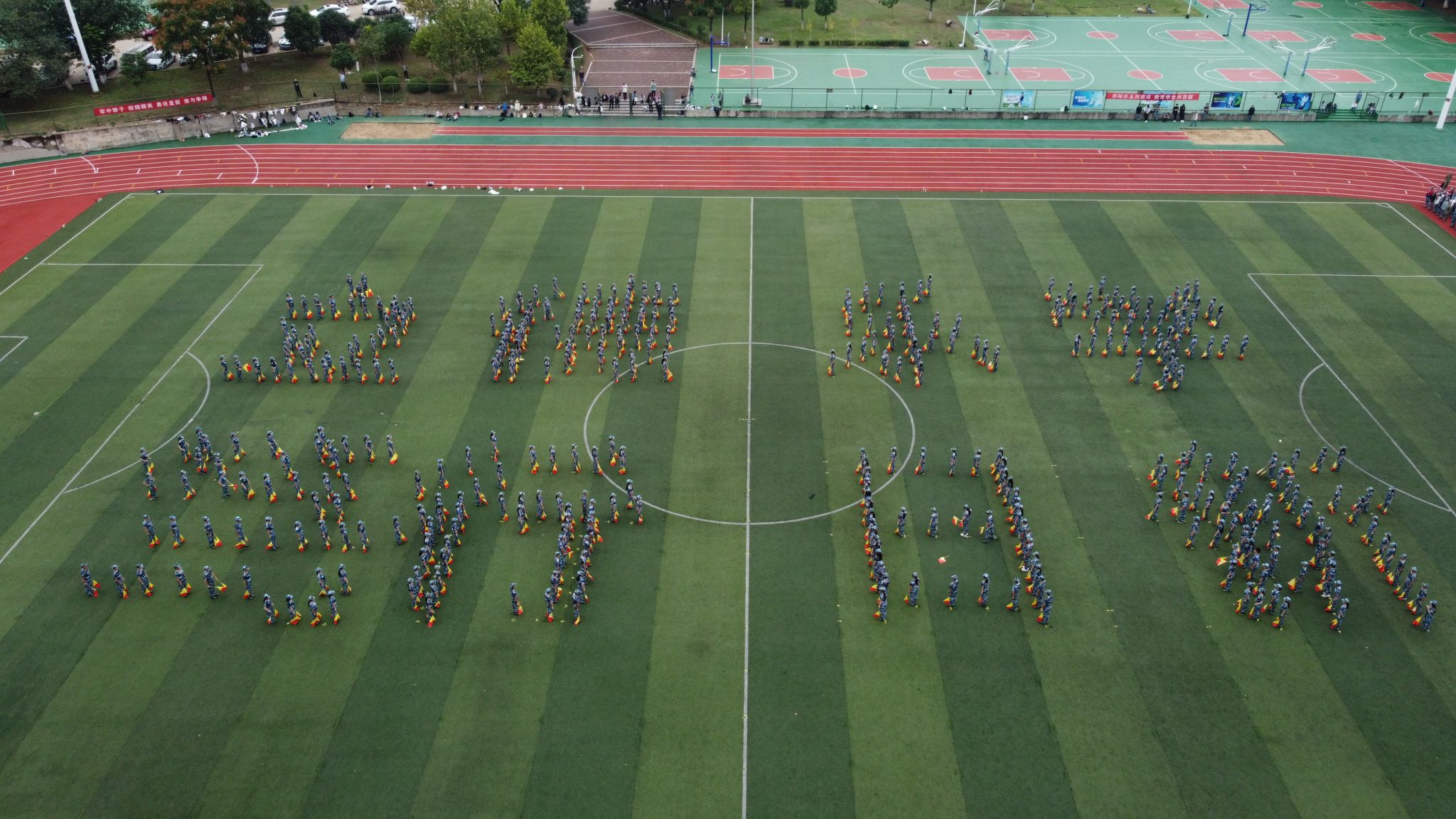“咱当兵的人们,有啥不一样,只因为我们都穿着朴实的军装……”,会操表演最后,新生彩旗队带来精彩的方阵拼字表演。他们身着迷彩,手挥彩旗,目视前方,站姿和手势跟随着旋律不断变换,整齐列队呈现出校训“立德、乐学、笃行、日新”的图案,诠释出华夏学子的爱校情怀,将大会气氛推向高潮。