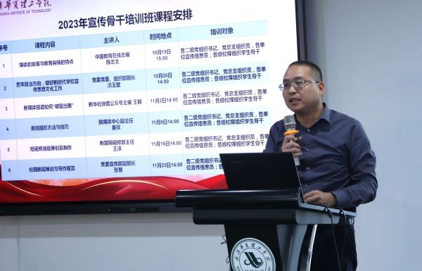 为贯彻落实习近平总书记关于宣传思想文化工作的重要思想,提高全校宣传工作队伍思想理论水平与业务能力,10月19日,由党委宣传部牵头组织的2023年宣传骨干培训班开班仪式暨首场专题讲座在综合楼1401会议室拉开帷幕。校长助理、党政办公室主任胡水兵出席并讲话。党委组织部、党委宣传部、校团委主要负责人,各二级党组织书记、党总支组织员,各单位宣传信息员,各校媒学生骨干参加。