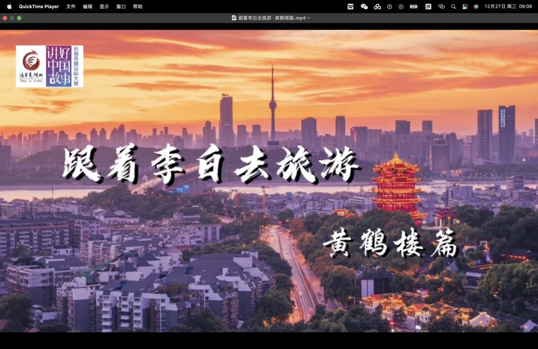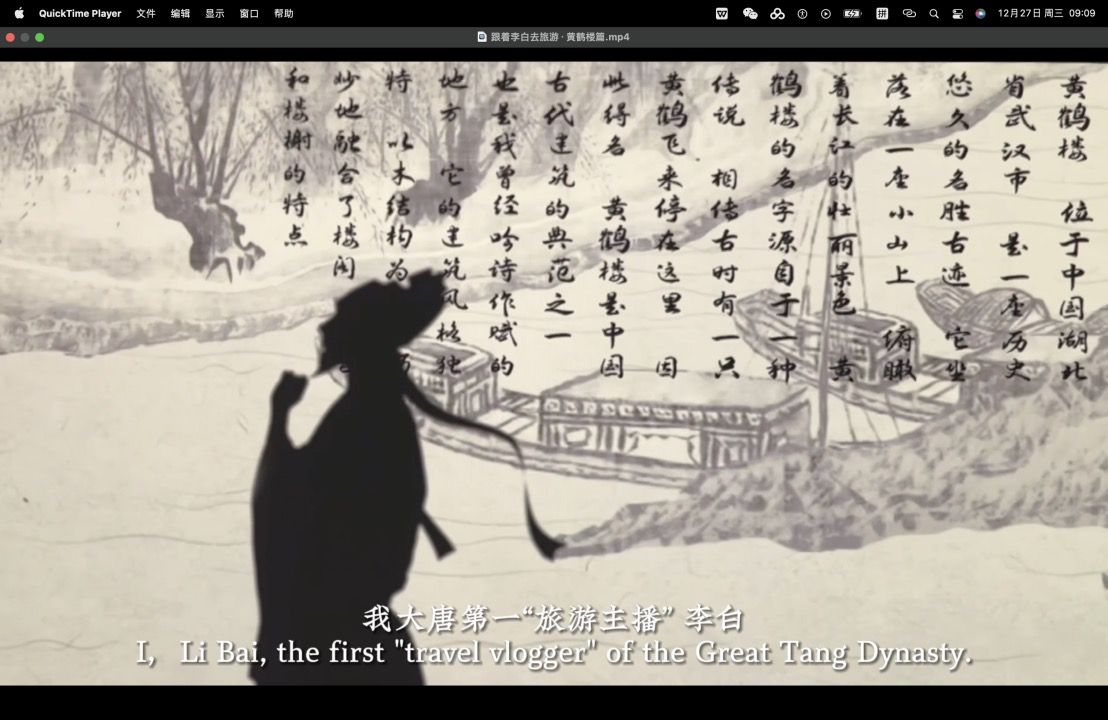 《跟着李白去旅游·黄鹤楼篇》由艺术设计与传媒学院教师李芷暄指导,网媒1217班汤乐涵、覃岳璇、李湘熙、徐佳妮共同创作,灵感来源于此前黄鹤楼美术馆举办的“一座楼与一座城”黄鹤楼1800年互动体验展。作品以李白作为“旅游博主”的视角去讲述自己与黄鹤楼的历史渊源,采用“动画+实拍+素材”相结合的视觉形式创作,并辅以中英文双语字幕呈现,展现了千年前李白、崔颢、孟浩然之间的友谊。
