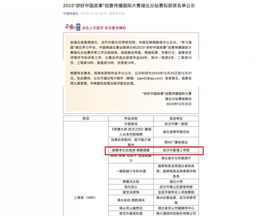 12月25日, 2023“讲好中国故事”创意传播国际大赛湖北分站赛区评审工作落下帷幕。我校艺术设计与传媒学院网媒1217班学生短视频作品《跟着李白去旅游·黄鹤楼篇》荣获三等奖。