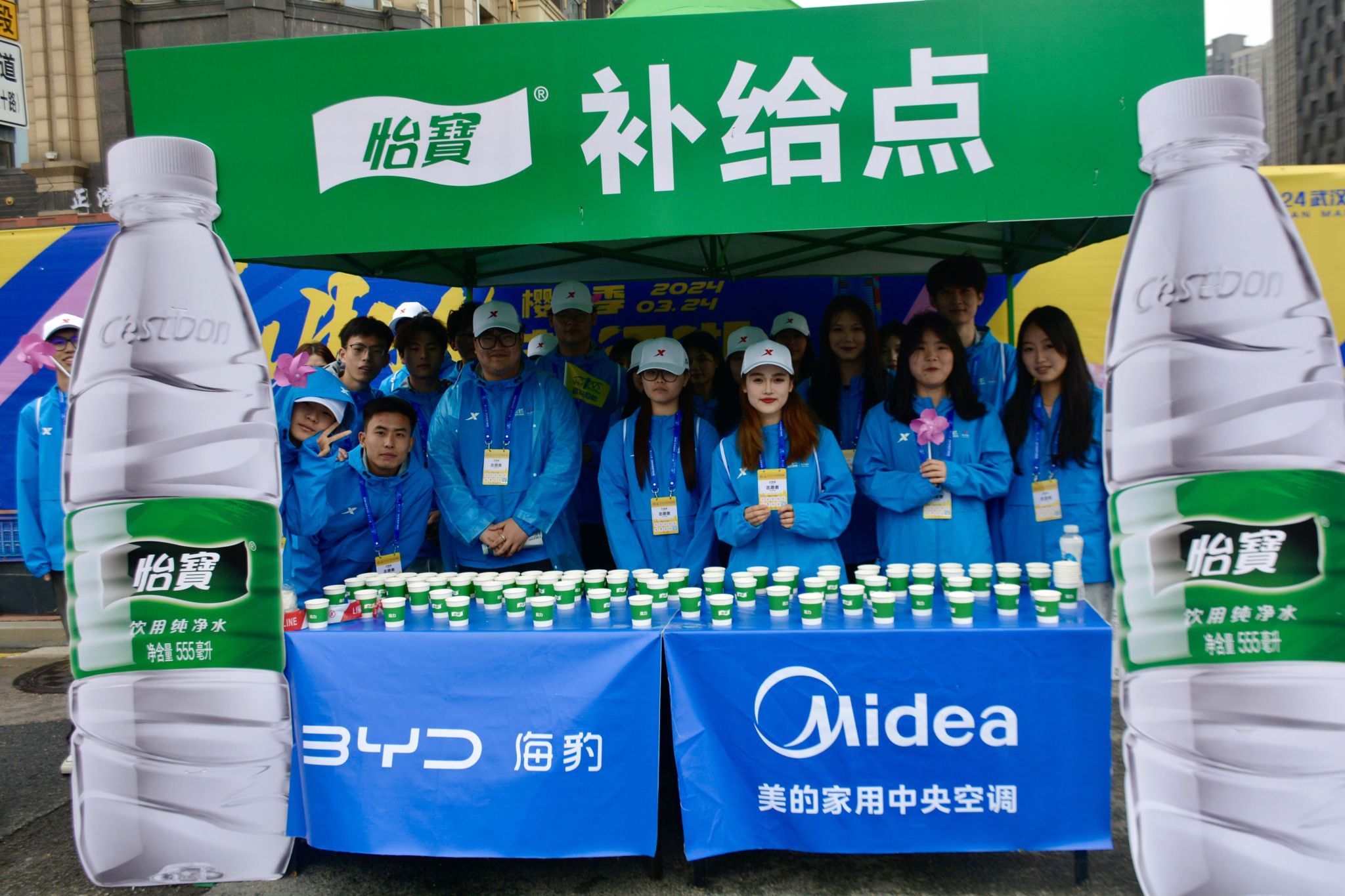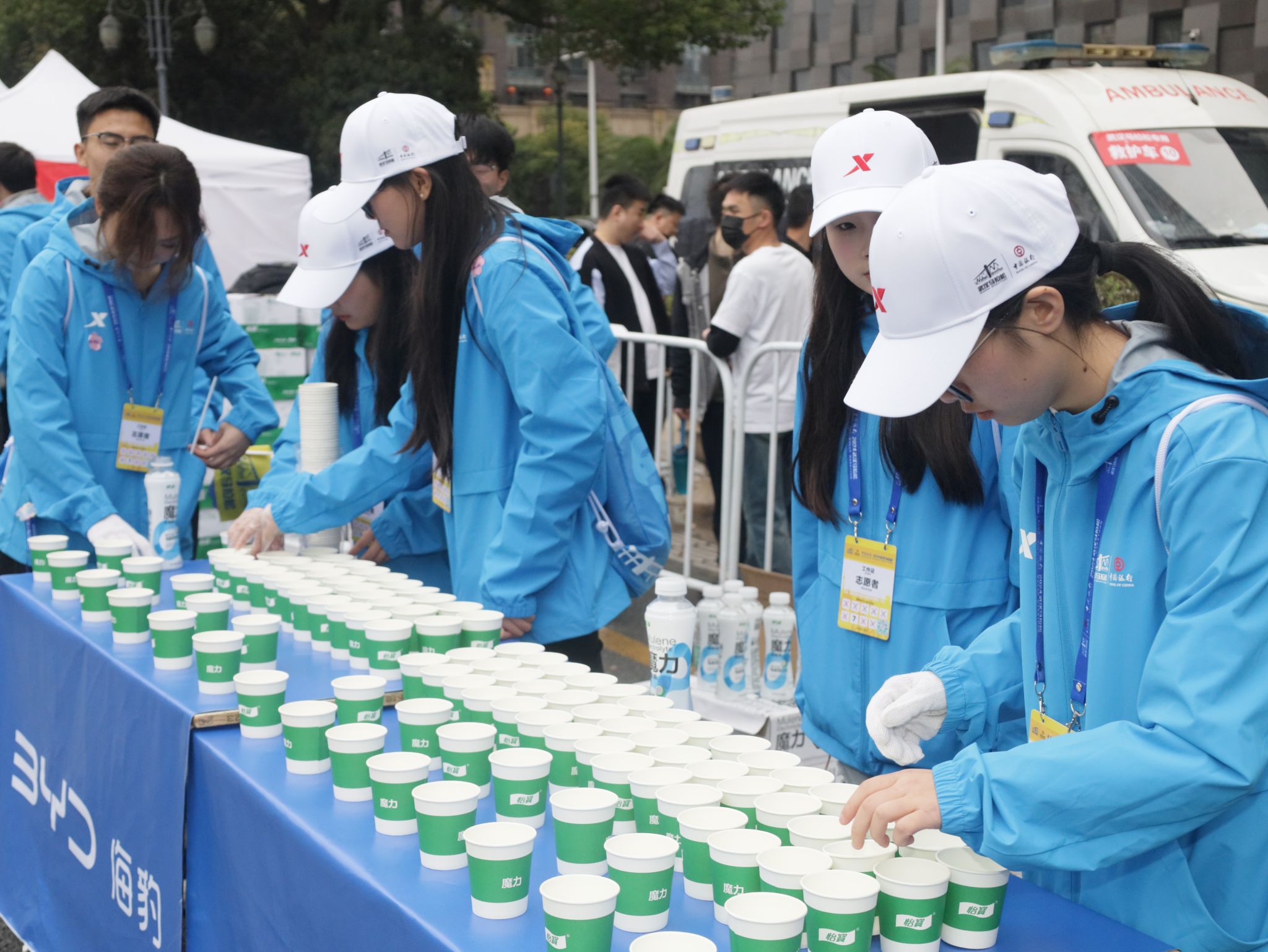 在运动员到达本站前30分钟,身着统一蓝色服装的志愿者们已经做好了所有准备工作:主动开启饮料饮水包装,拧松瓶盖,将饮料和矿泉水按照三分之一的份量倒在水杯之中,并将水杯按照前排斜向松散、后排密集的方式有序摆放在桌面上……站在服务点前,随时准备为选手们提供帮助。他们的脸上洋溢着笑容,眼中闪烁着期待的光芒,为每一位途经站点的选手热情挥手、加油鼓劲。