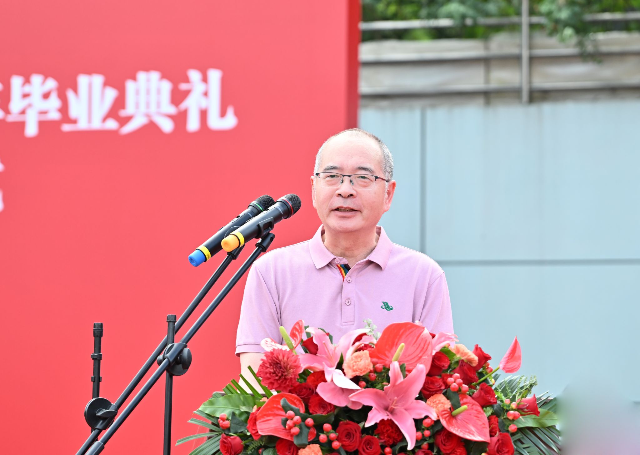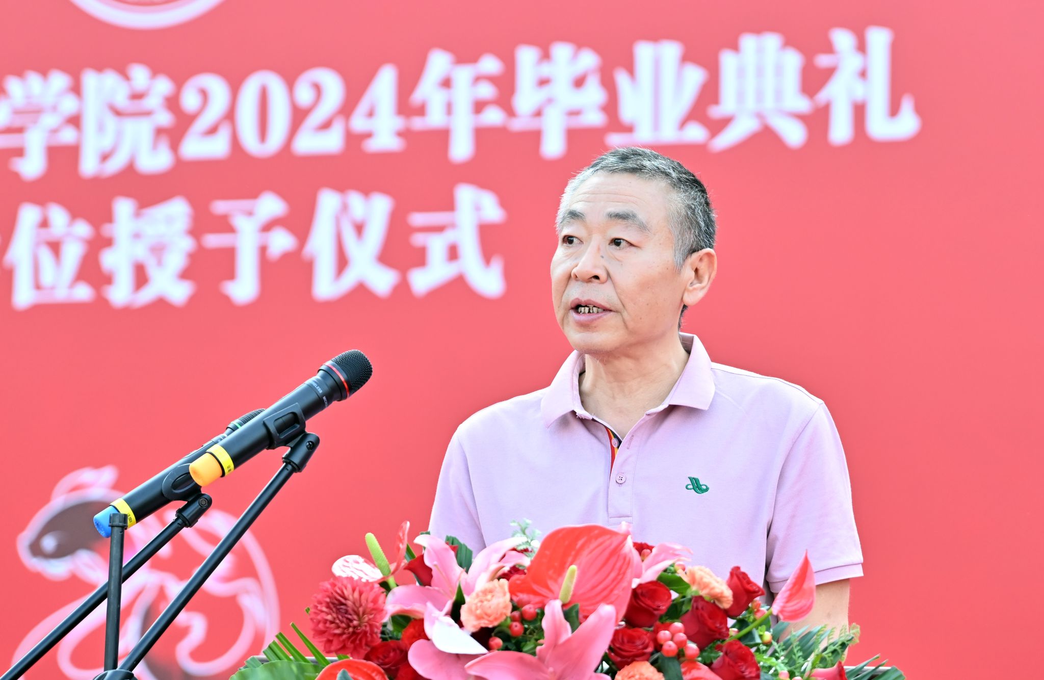 校长吴永桥发表致辞。他代表全校师生员工为毕业生送上了最热烈的祝贺和最美好的祝福,并高度赞扬了过去四年间同学们在就业深造、西部计划、学科竞赛、自主创业等领域取得的优异成绩。面对即将开启人生新篇章的毕业生们,吴永桥提出四点希望与毕业生共勉:一是希望同学们以“立德”为舵,锚定前行的航向,把人生之路走正。将个人的理想追求融入党和国家事业之中,坚定不移地听党话、跟党走,争做有理想、敢担当、能吃苦、肯奋斗的新时代好青年;二是希望同学们以“乐学”为帆,厚积前行的动力,把人生之路走远;三是希望同学们以“笃行”为桨,发出前行的航线,把人生之路走实;四是希望同学们以“日新”为体,赋能前行的速度,把人生之路走快。积极主动拥抱未来、掌握新技术、运用新技术,为新质生产力插上腾飞的翅膀。