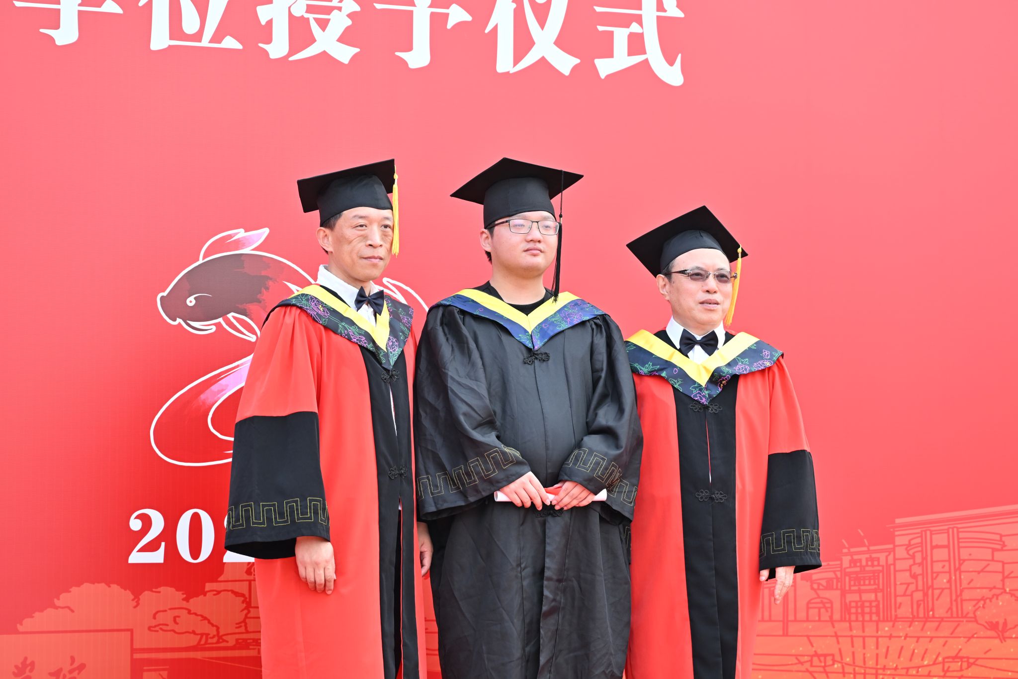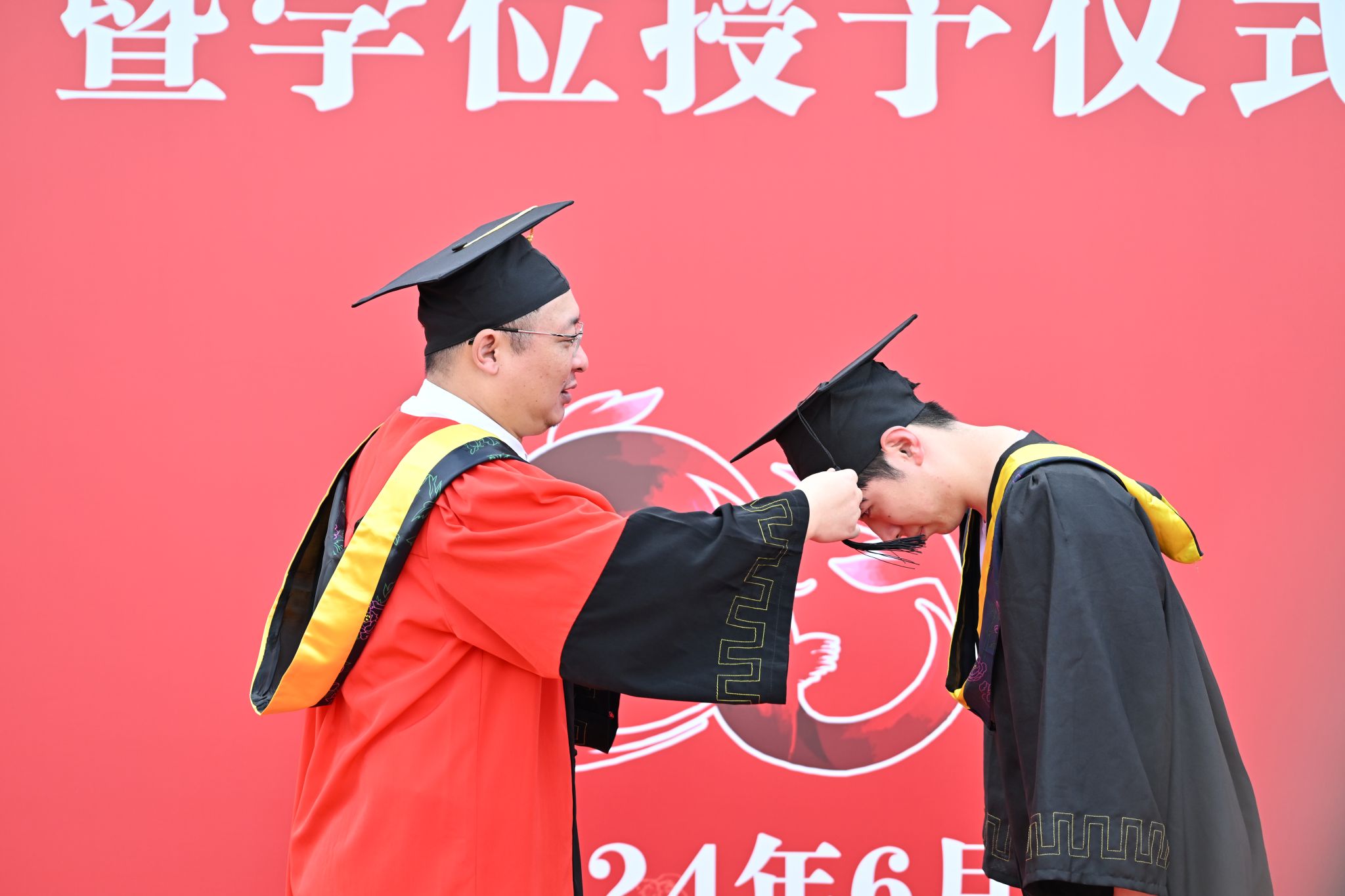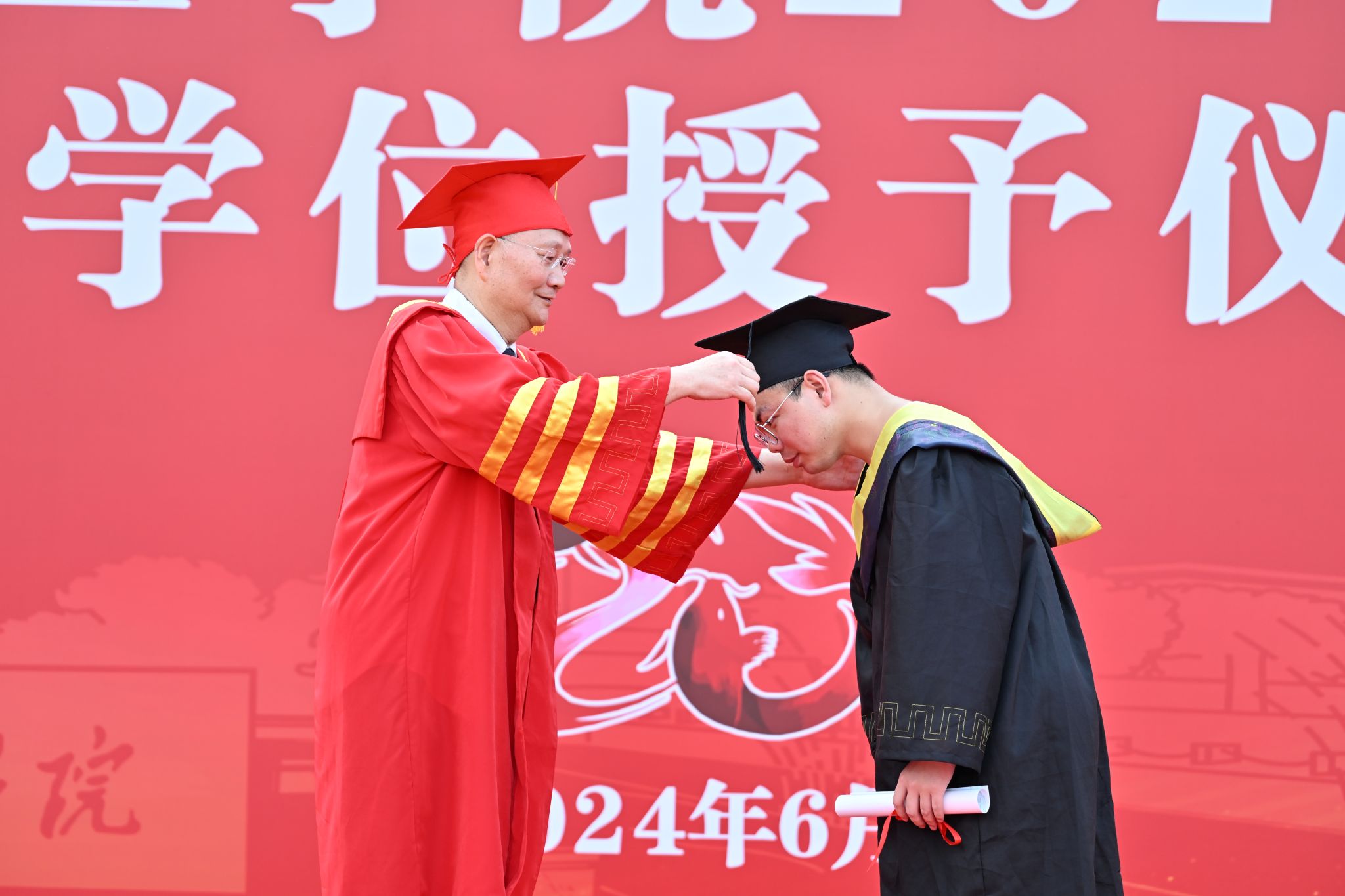 学位授予环节,吴永桥和各学院院长为依次上台的毕业生们逐一拔穗正冠,与大家亲切合影留念。