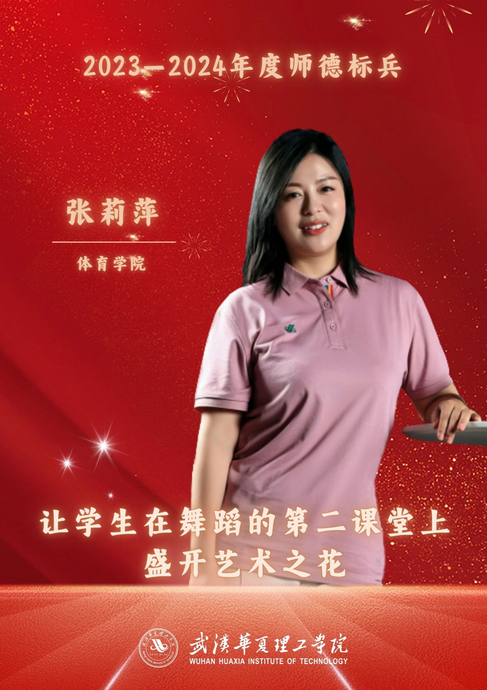 张莉萍,女,中共党员,公共体育课部主任、副教授。她从教18年来,立足于教学一线 ,精心构建“五维三阶一体式”公共体育通识教学工作法,踊跃投身于教学改革与探索实践,站在“育人为本、质量至上”的高度去挖掘学生在体育活动中进行思维认知能力的培养。全力投入课内外一体化“竞赛育人”,指导学生获湖北省大学生体育舞蹈线上锦标赛甲组青春校园舞第一名、中国大学生体育舞蹈线上赛普通院校组校园青春舞获二等奖等奖项。曾获教学质量优秀奖、优秀班主任、教学新人优秀指导教师、课程思政教学设计大赛三等奖等荣誉。