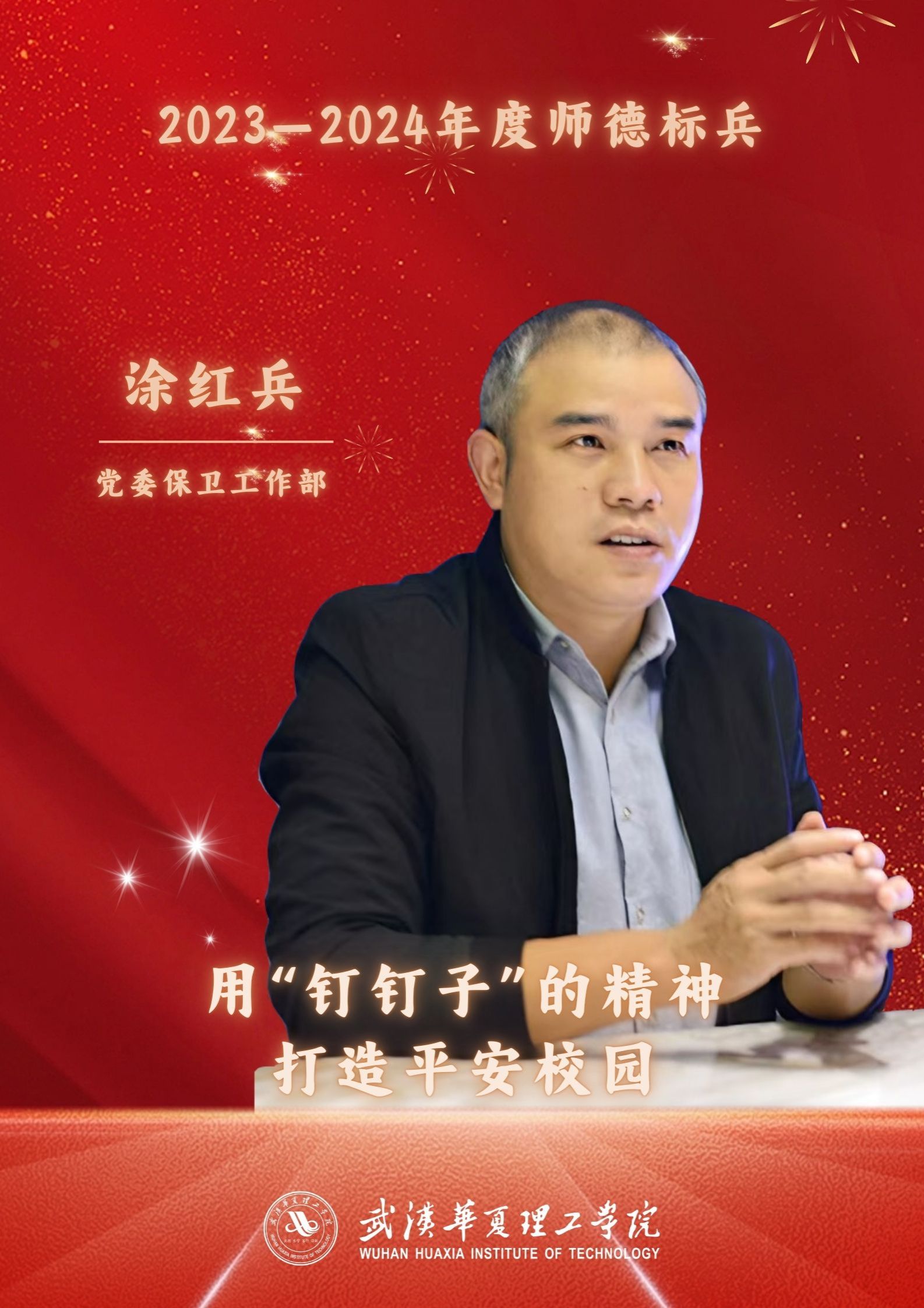 涂红兵,男,党委保卫工作部治安管理办公室主任。他认真对待师生的报警求助,做到“有警必接,有案必查”,积极化解各类矛盾纠纷,深入践行“矛盾不上交、平安不出事、服务不缺位”的新时代“枫桥经验”。作为保卫骨干,他把“三能”精神真正践行到工作中,体现到行动上“能吃苦,能奉献、能战斗”,一丝不苟地完成各项任务,就像一颗钉子牢牢“钉”在了工作岗位,纵使青丝变白鬓,他从未忘记服务保障人员的工作职责,守护校园安全。曾获湖北省高校平安校园建设工作成绩突出个人、东湖高新区防范电信网络诈骗工作先进个人等荣誉称号。