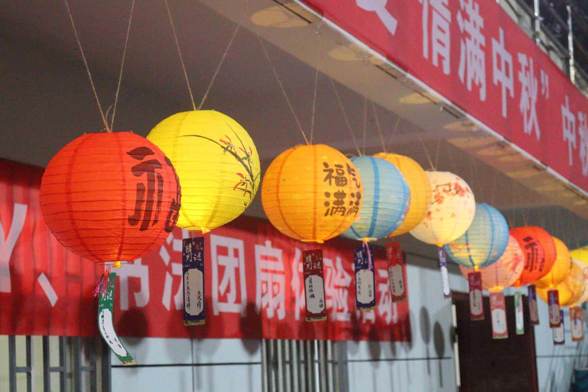 猜灯谜区,一排排彩色的中国风灯笼高悬展台,一个个妙趣横生的谜语镶嵌其中。“中秋别后重团圆” “元宵中元中秋”……谜底是什么?新生与好友激烈讨论着,时不时传出猜出谜底的欢呼声,现场热闹非凡。