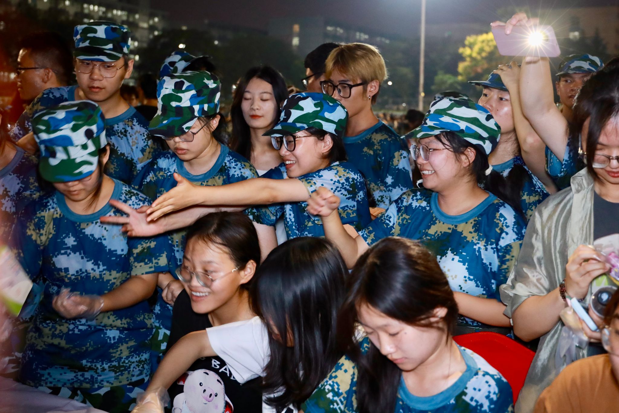团扇书法体验区里,书法社的同学们应新生们的要求,忙碌地现场书写团扇、书签等,而另一边的新生们,则在大大方方地展示才艺。“明月几时有、把酒问青天……” 彩灯装饰的表演区内,新生们带来一首首耳熟能详、节日气氛浓烈的歌曲,吸引众多观众围观和应和,现场温馨而浪漫。