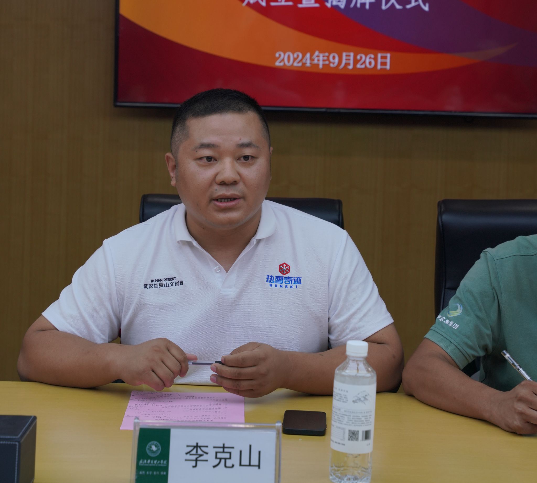 融创热雪奇迹集团人力资源总监李克山、湖北文旅趣野营运营管理部部长袁沺对我校体育大健康产业学院的正式揭牌表示祝贺,表示将全力支持产业学院的各项工作,希望双方在人才培养和科研创新方面开展深度合作,实现互利共赢。