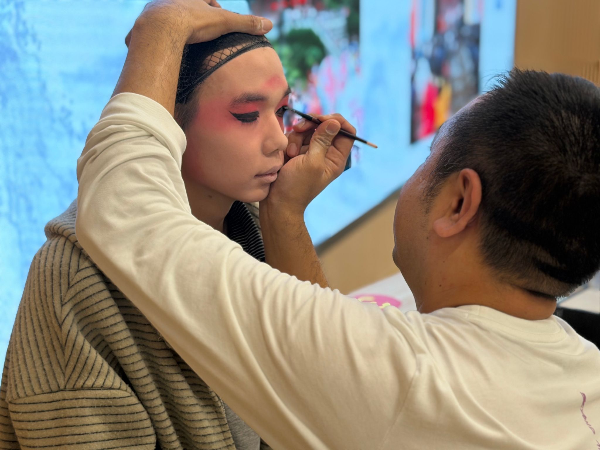 活动现场,两名同学在王荔老师的邀请下登上舞台,由武汉汉剧院邱凌、彭冲老师现场进行汉剧妆容塑造和戏服穿戴。从描眉画目到整装束发,每一个细节都展现出汉剧艺术的精致与讲究。王荔老师在旁讲解道:“汉剧妆容讲究修容自然、打光配合角色气质,服饰配饰既要符合人物身份,又要保证演员表演的灵活性。”
