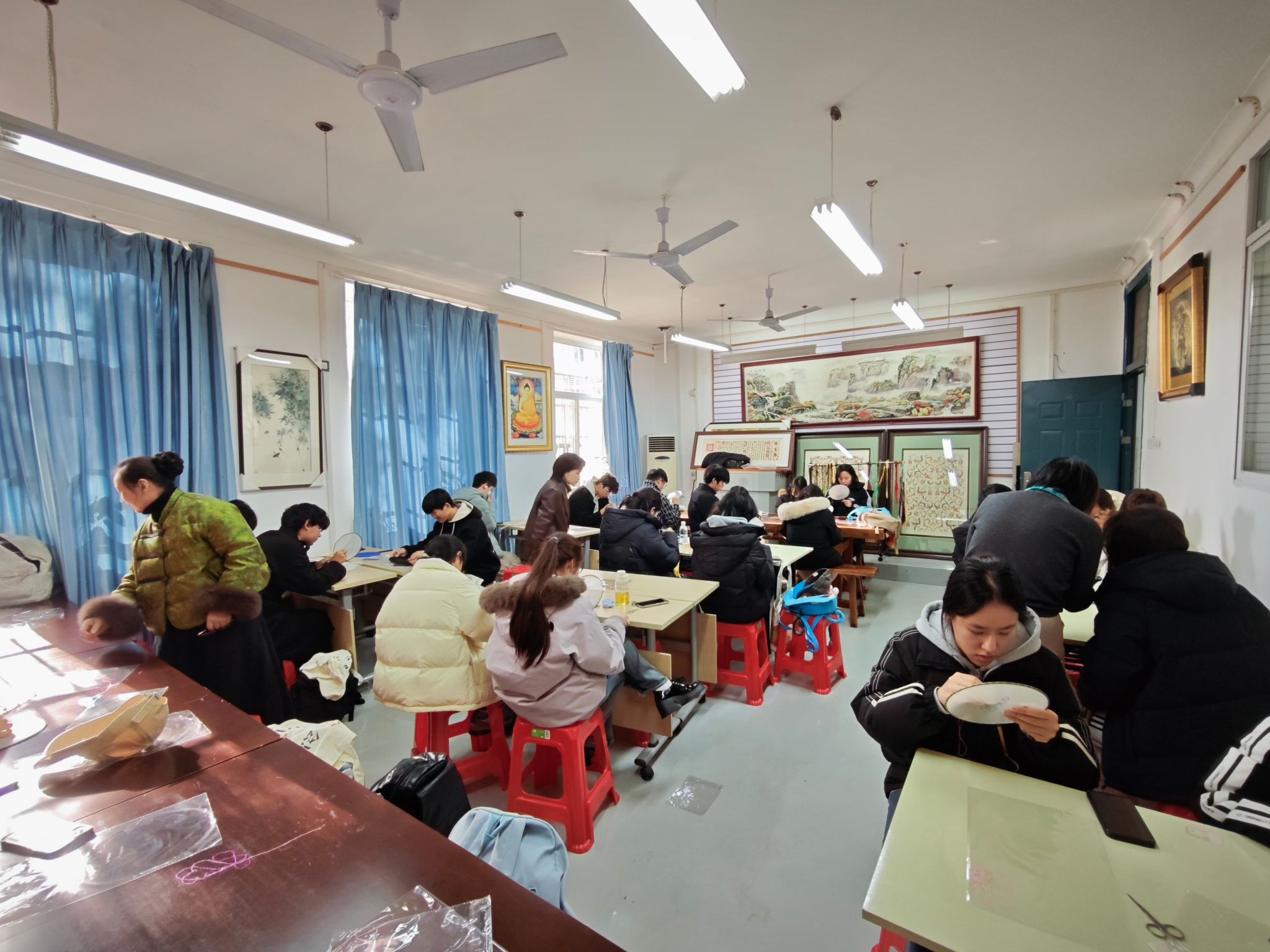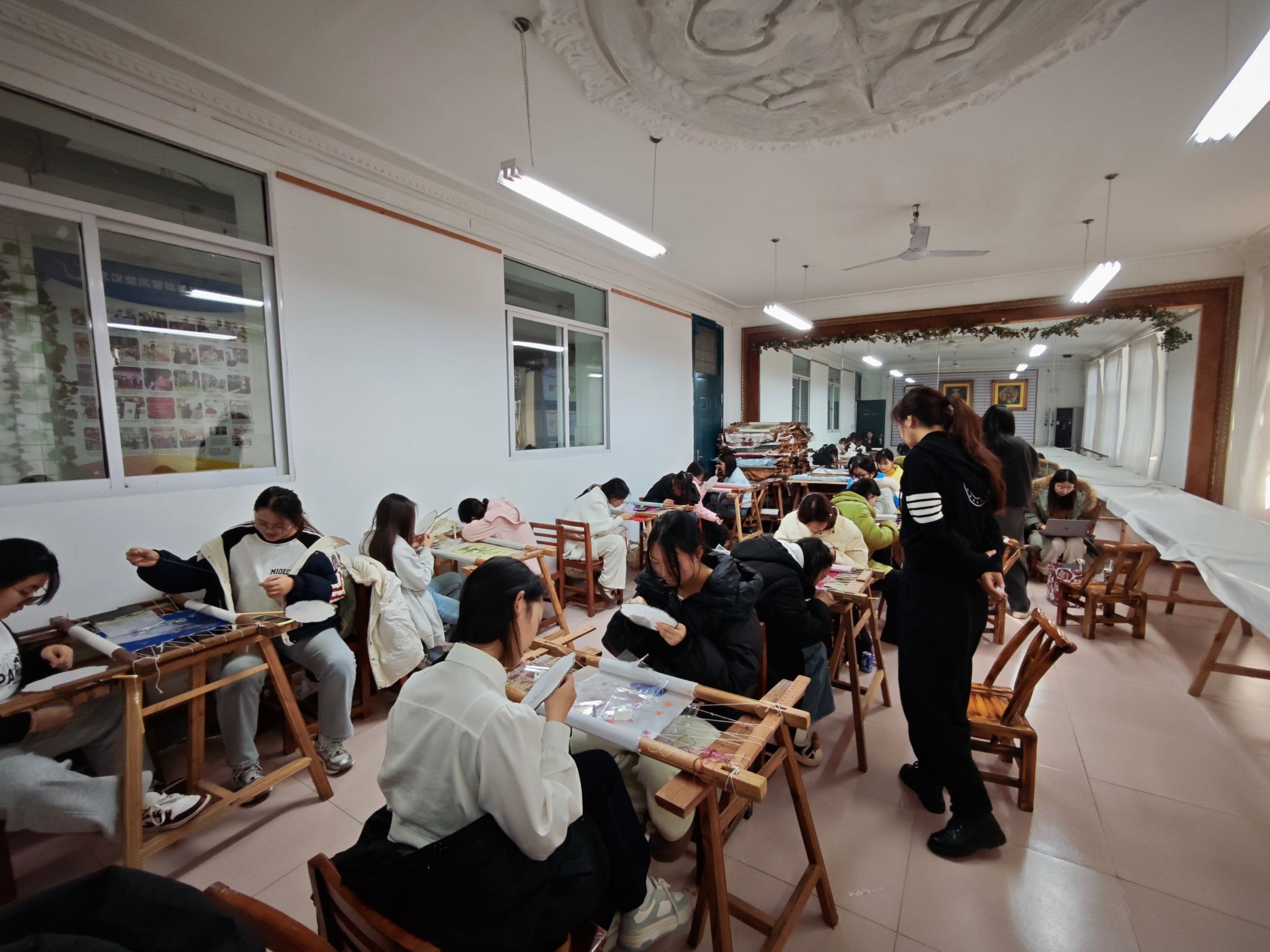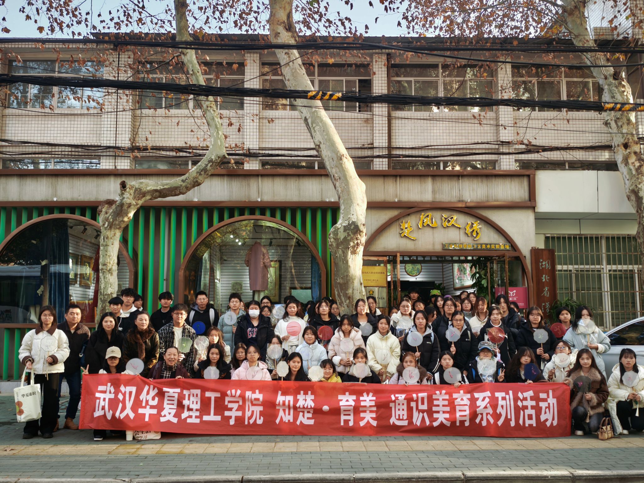 12月14日,武汉华夏理工学院“知楚·育美”通识美育系列活动——汉绣研学实践在武汉楚凤汉绣工坊圆满开展。活动由通识教育学院许莉、涂俊夫与艺术设计与传媒学院蒋樱、焦洁四位老师共同带队,百余名2025级学生从梧桐湖校区出发,走进汉绣工坊,近距离体验非遗技艺的独特魅力。