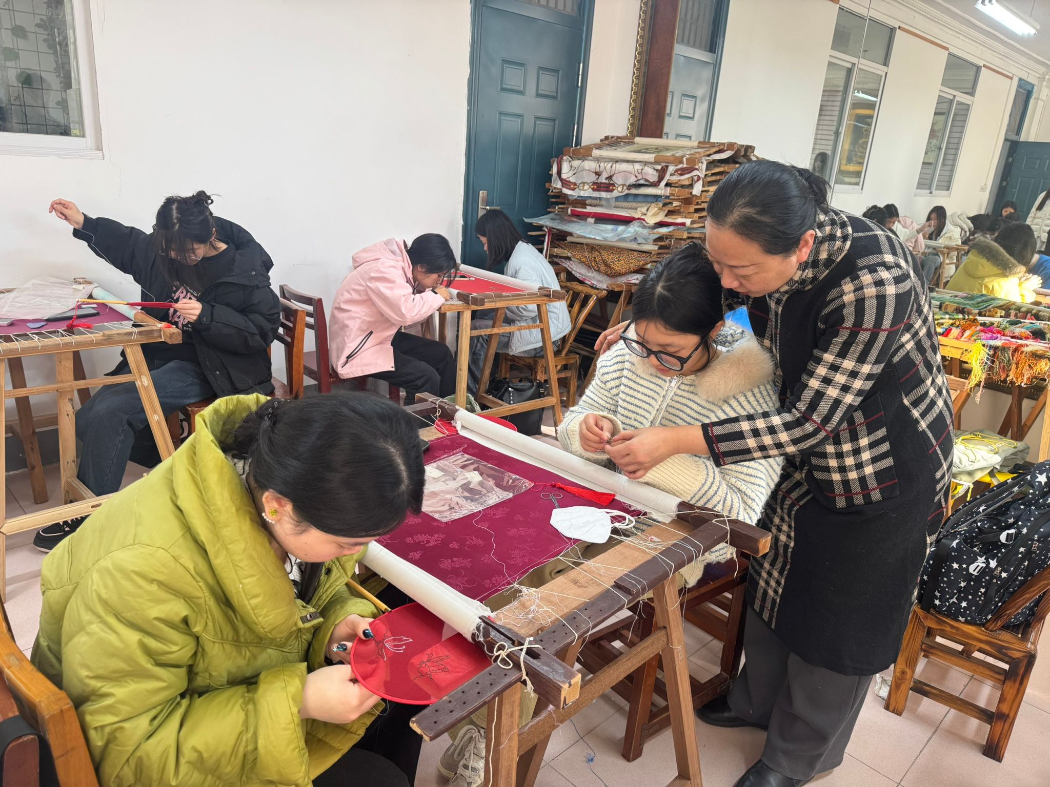 楚凤汉绣工坊内,湖北省汉绣协会会长陈慧与十余位汉绣大师热情迎接师生一行。为保障教学效果,学生们分为四组,在汉绣师傅的悉心指导下,系统学习了汉绣中经典的“滚针”与“锁针”技法。从穿针引线到纹样构图,同学们在亲手实践中逐步领悟汉绣工艺的精髓,绣制出蝴蝶、翠竹、幽兰、凤凰、荷花等蕴含文化意蕴的图案。工坊内彩线纷繁,指尖起落之间,传统纹样渐次绽放于布帛之上。