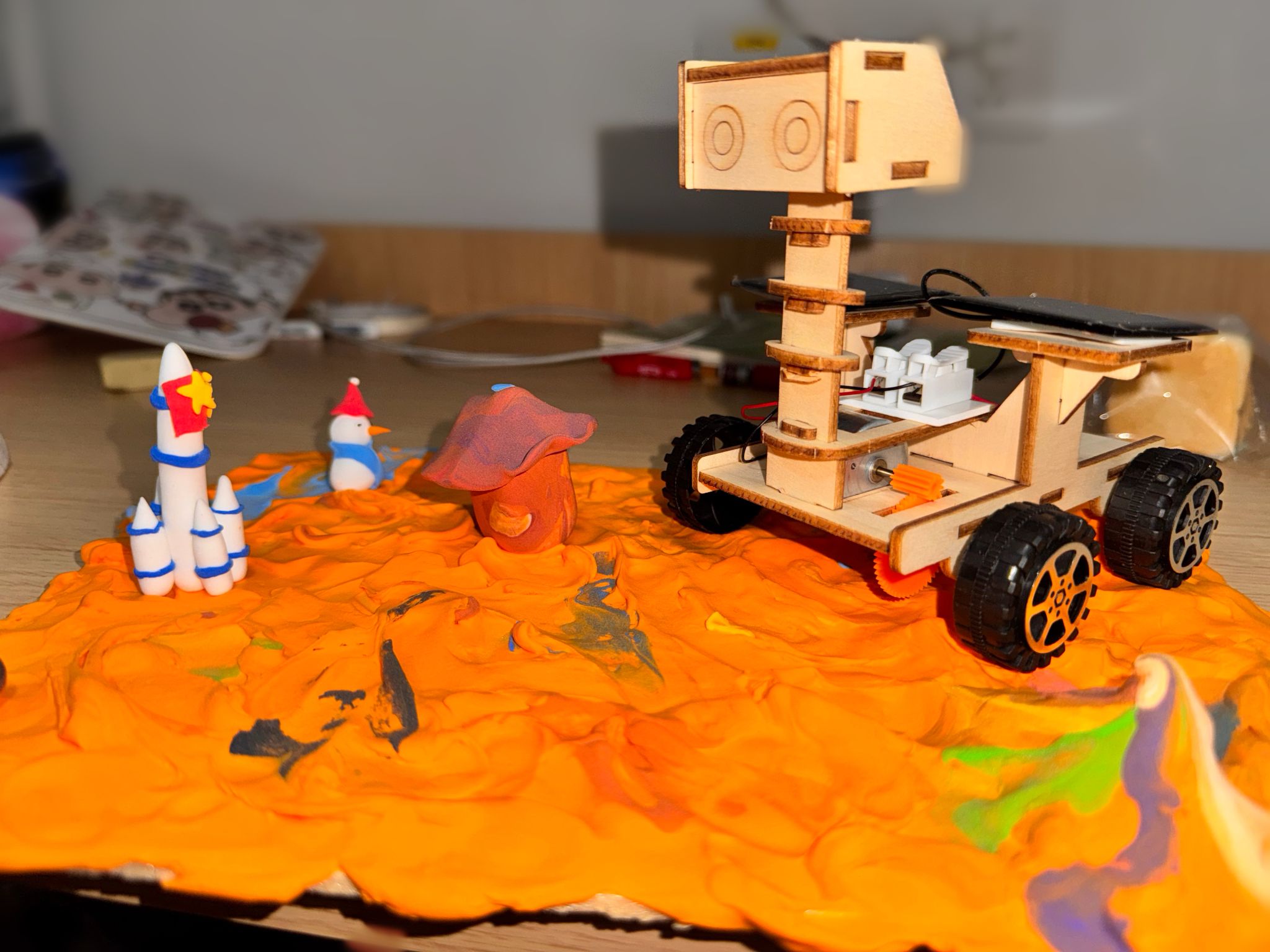 在实践环节,此次活动精心设计了火星车制作和火星城市设计两个部分,在“火星车制作”中,学生们动手拼接、搭建太阳能驱动的小车模型。尽管结构简化,但光能转化为动能的完整原理链条清晰可见。当一辆辆小车在太阳下开始移动,关于清洁能源、动力传输的抽象知识变成了真切可感的成就。在“火星城市设计”中,同学们通过超轻粘土和各类材料,发挥创意搭建出形态各异的火星城市模型。有的同学设计了宇航员和宇宙飞船的停靠站,有的同学构建了火星生态这些充满想象力的作品不仅展现了同学们对火星生活的憧憬,更体现了他们对科技与未来探索的浓厚兴趣。