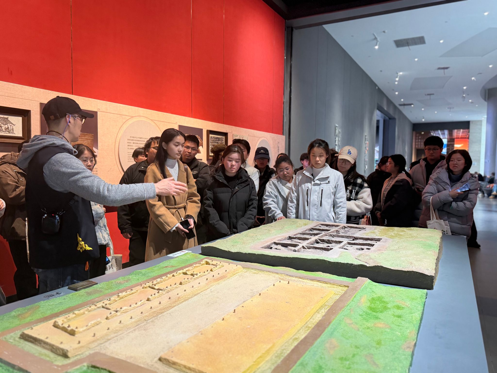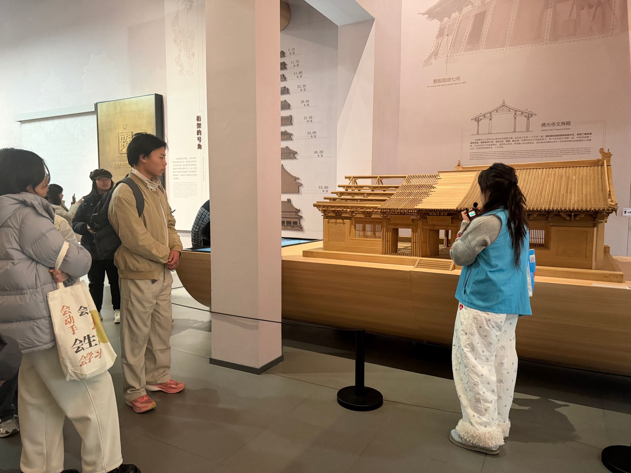 “古代建筑不仅是技术与艺术的结晶,更是体现了‘天人合一’的世界观。”随后,姚老师详细地向大家讲解了古代建筑展,同学们亲手触碰榫卯接口,并通过模型理解“斗拱铺作”如何如花朵般层层出跳,将屋檐的重力优雅地传递至立柱。在应县木塔前,同学们纷纷感叹木构建筑历经地震而不倒的抗震智慧。佛光寺东大殿的斗拱雄大、出檐深远,其独特的建筑风格让同学们深刻领略到古代匠人的精湛技艺。故宫太和殿那屋脊之上,排列着造型各异、栩栩如生的屋脊兽,它们不仅是古代建筑装饰艺术的杰出代表,更从侧面体现了该建筑等级之高。通过细致地观察和学习,同学们得以深入理解中华传统建筑文化的深厚底蕴和美学价值,以及其中所蕴含的丰富内涵。