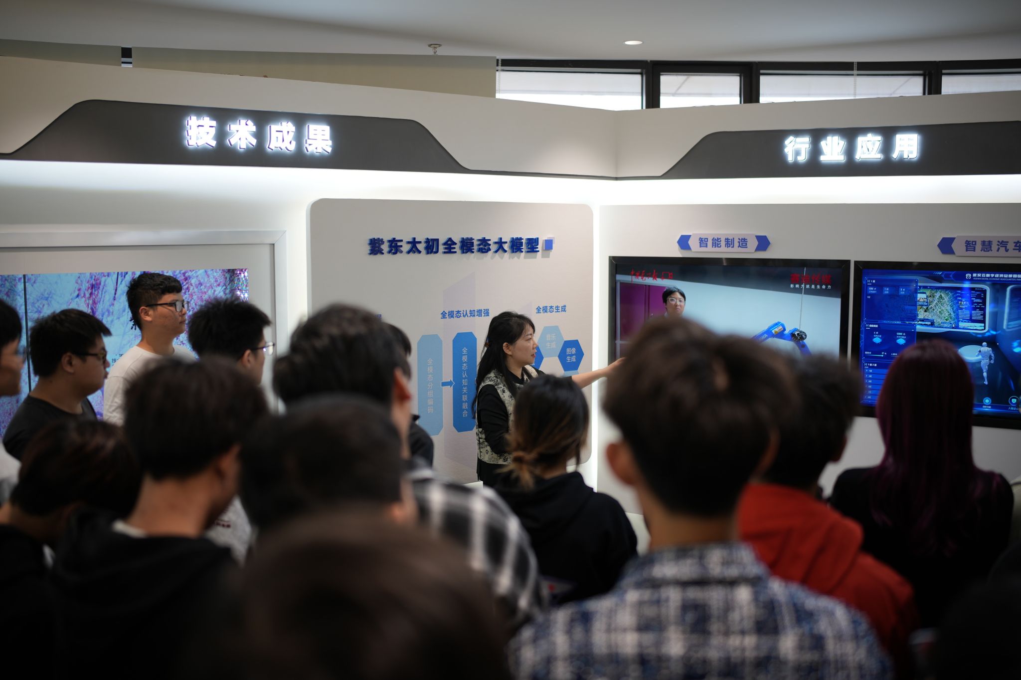 在武智院的科技展厅,同学们详细了解了武智院的发展历程,并认真听取了“紫东太初”多模态大模型的技术优势和应用场景介绍,同时亲身体验了数字人“小初”在图像、文本、音频等多个模态上的生成能力。