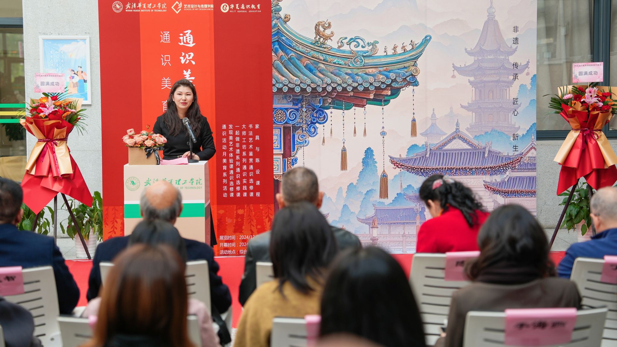 12月2日上午11:00,由教务部通识中心、艺术设计与传媒学院、湖北省艺术学名师工作室、华夏非遗研究中心与1957设计中心联合主办的“通识美育·居艺之境”通识美育课程联展在学校综合楼大厅一楼正式开幕。湖北省汉绣协会会长陈慧、枣阳葫芦雕刻传承人王发元、全体校领导、相关职能部门负责人、艺术学院师生代表参加活动。