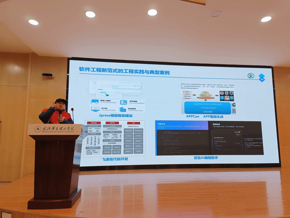 随后,喻博士详细介绍了模板智能建站、APP智能生成和低代码开发的核心技术及应用场景。他介绍道,AI编程工具在新范式中的作用。通过AI技术,代码的生成和审核更加精准,效率提升30%以上。它促使程序员的工作重点从编码转向高层次设计与架构分析,并极大地促进了团队协作。