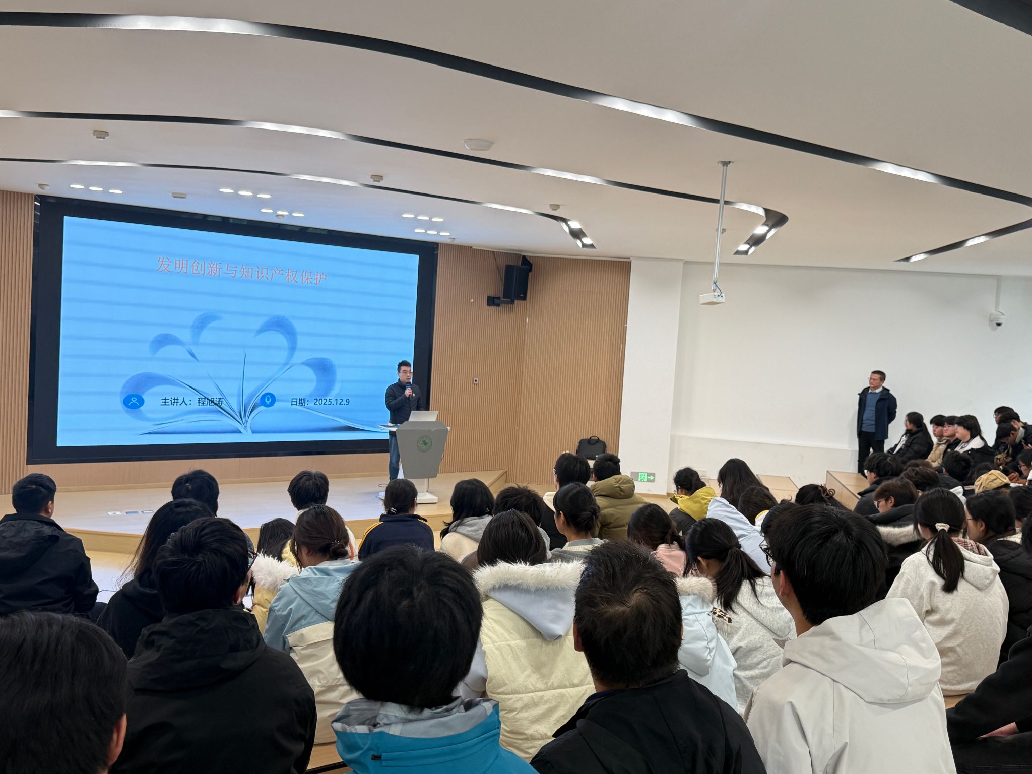 讲座伊始,程旭涛围绕“发明创新”这一核心,通过从日常生活中常见的事物切入,分享了如何从日常学习与生活中发现问题、提炼创意,并运用科学方法将创意转化为具体的技术方案或作品。他强调,创新并非天才的专属,而是有路径可循的思维训练,鼓励同学们打破思维定势,在探索中实践。随后,他着重讲解了专利类型、授予专利的条件及专利说明书的撰写技巧等实操知识,明晰了创新成果如何通过法律途径转化为受保护的无形资产,结合生动的热点案例,深入浅出地阐释了知识产权保护的重要性。