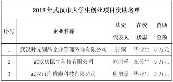 根据《关于支持百万大学生留汉就业创业若干政策措施》(武办文〔2017〕53号)和《武汉市高校毕业生创业项目资助管理办法》(武财规〔2015〕838号)文件精神,通过项目申报、项目初审、复审、专家评审、社会公示。决定给于择优评选出的264个项目资金资助,给予3万至20万的资助。其中武汉时光颖品企业管理咨询有限公司和武汉房医生科技有限公司各获得5万元资助,武汉市海维鑫科技有限公司获3万元资助。
