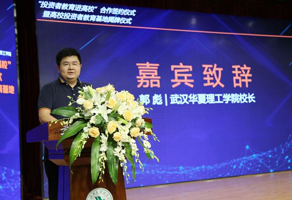会议伊始,郭彪致辞。他首先代表学校对湖北证监局领导的来访表示热烈的欢迎,向天风证券对我校教育事业的大力支持表示衷心的感谢。他讲道,我校建校15周年来,大力推进产教融合,坚持市场化、职业化、国际化的办学方向,为区域经济的发展培养高素质应用型的人才。他指出,天风证券为我校搭建了一个投资者教育的优质平台,很好的结合了我校通识教育改革和课程体系建设工程。学校将以此为契机,在学生群体中大力普及证券期货知识,开发我校投资者教育系列课程,同时配合专家讲座、主题公开课、选修课等多种形式将投资者教育纳入我校通识教育和学生体系中,提升学生理性投资意识和风险防范能力。