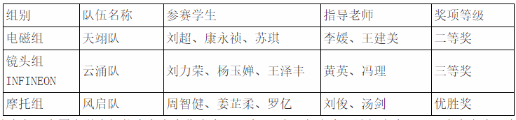 我院共派出了3支队伍分别参与了电磁组、镜头组INFINEON、摩托组等三个组别的竞赛,所有队伍均顺利完赛,获得华南赛区1个二等奖、2个三等奖。具体获奖情况如下: