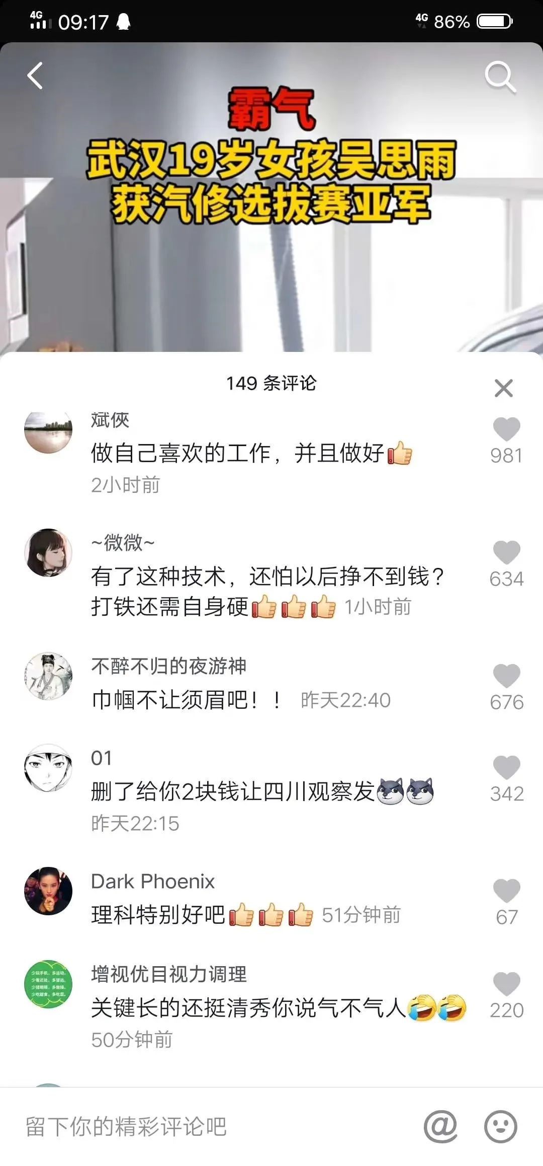一张眉目清秀的娃娃脸,讲起话来大大咧咧……前些日子,你有被这样一个女孩刷过屏吗?40分钟内排除10个故障、武汉19岁女孩获世界技能大赛汽修项目湖北选拔赛亚军。湖北日报、武汉晚报等媒体纷纷报道,就连抖音、微博你也能刷到