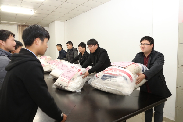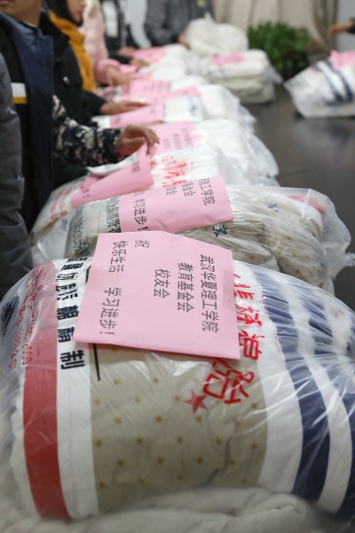 11月21日天气预报报道,武汉即将进入今年严寒天气,学生辅导员通过深入到学生宿舍走访,以及平时所掌握的学生情况,了解到少数家庭经济特别困难的学生缺少御寒衣服和棉被,学生工作处紧急采购了一批防寒棉衣、棉被送给这些学生,希望他们能够安心学习、快乐生活。11月23日中午,部分学生收到御寒棉衣和棉被后对学校表示感谢,一位受捐赠学生留下了字条“寒衣件件寄温情,暖意融融映真心”,悄悄放在了学生事务中心的办公桌上。