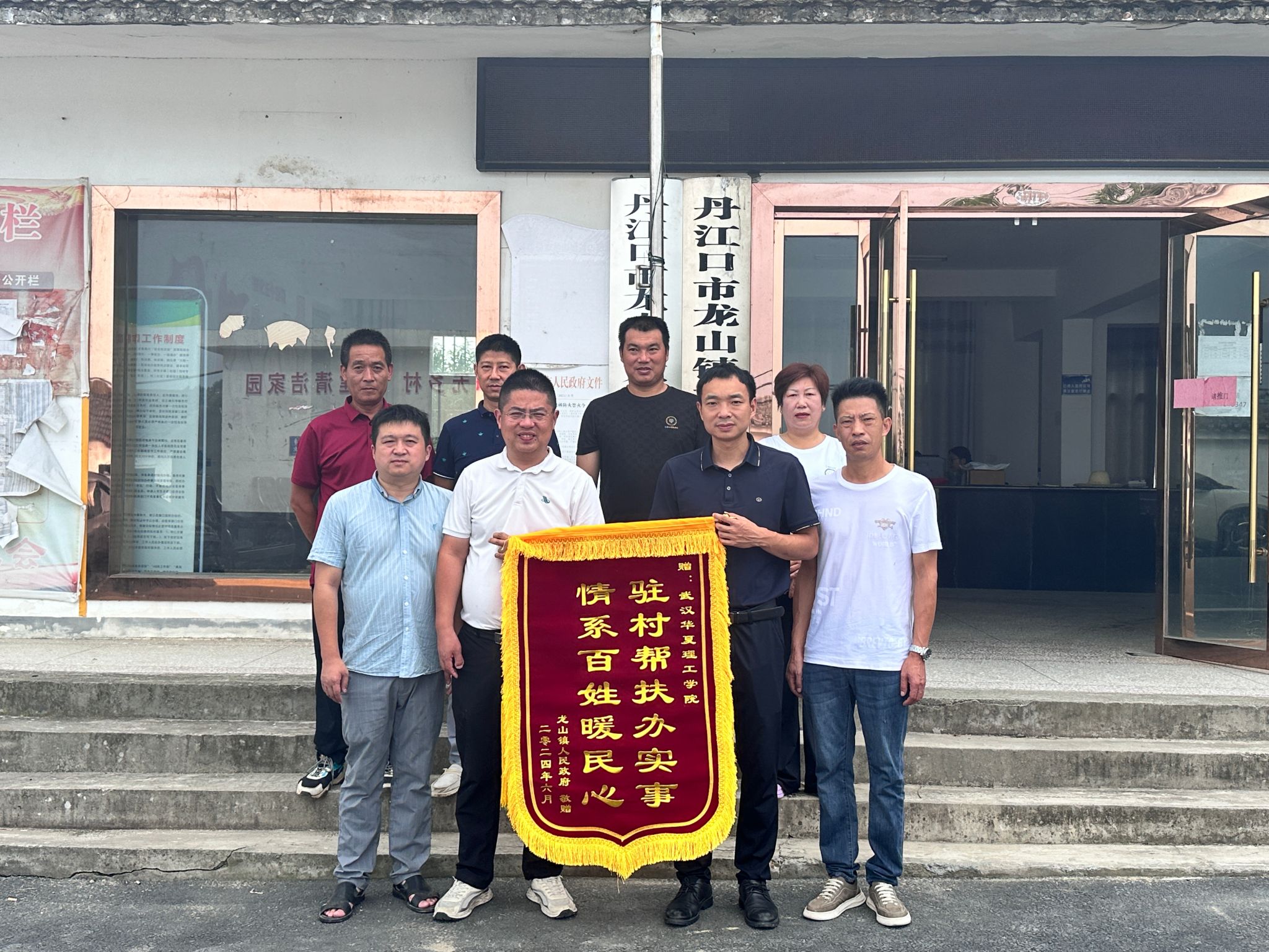 8月8日,丹江口市龙山镇人民政府将一面绣有“驻村帮扶办实事,情系百姓暖民心”的锦旗送给学校,以此表达龙山镇人民政府对学校在驻村帮扶及共同缔造工作中给予的大力支持的诚挚谢意。丹江口市龙山镇党委副书记李从臣代表镇政府赠旗,学校驻村工作队队长黄大伟代表学校接受赠旗。