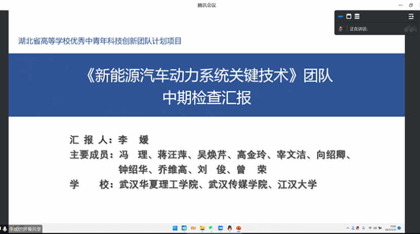 负责人李媛老师就创新团队获批以来在科学研究、学术交流、社会服务等方面的工作进行了汇报,对团队的研究内容、成员分工等情况作了介绍,并指出了团队在建设过程中存在的主要问题。在研究内容及成员分工方面,李老师表示团队下一步的建设目标是进一步凝练并形成稳定的研究方向,提升团队科研水平,申报高水平项目,争取取得高水平科研成果。研究方向主要围绕新能源汽车新型动力系统的研制和测试方法、新能源汽车动力系统的动力学分析方法以及关键零部件虚实融合教学系统开发共三个方面开展。各方向带头人针对团队建设目标及要求,也提出了相关建设性的意见和建议。