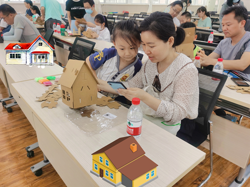 “我发现有车辆乱停放,张贴的小广告很影响社区美观,地上的垃圾影响了社区的环境卫生……”13组家庭在向添媛老师的带领下一起参与社区云调研,纷纷指出“全景地图”中存在的“问题怪兽”,孩子们踊跃参与,共同分析社区现状,增强对社区公共事务的责任感,亲子家庭还共同承诺:爱护社区环境,在生活中践行低碳环保的生活理念,共同缔造绿色繁荣社区。由三位助教老师带领亲子家庭共同消灭“问题怪兽”并创造梦想家园。孩子们发挥自己的想象力,从儿童视角进行梦想家园DIY活动。“我想用家里的废纸壳做一个滑滑梯。”“我想让妈妈帮忙用闲置的毛线做一个秋千。”“我想收集的干花装饰我的梦想家园。”小朋友奇思妙想,借助多样的“废弃”材料展示自己梦想中的小乐园,他们天真童趣的作品展现出了不一样的视角。