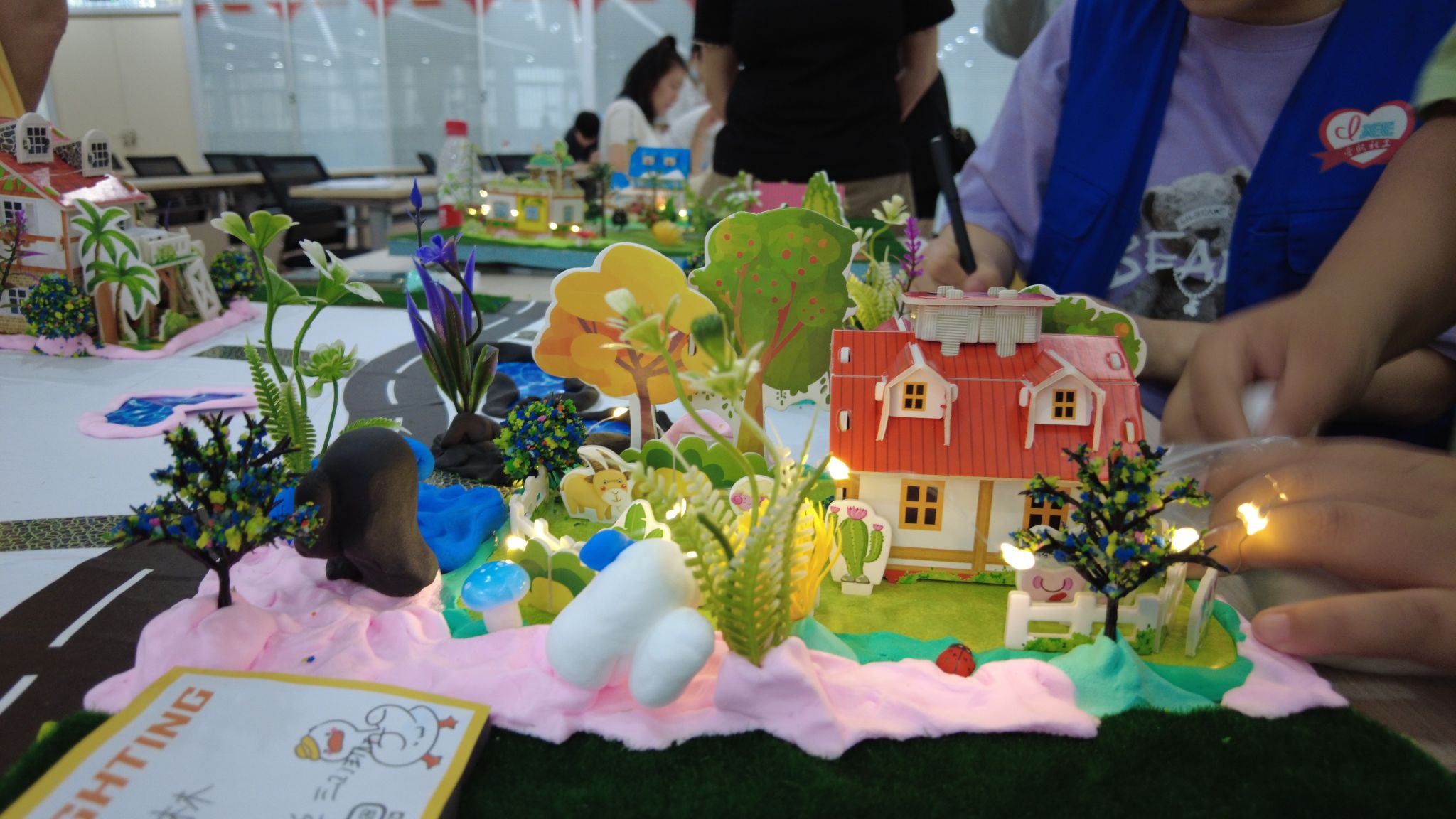 本次课程内容分为前情回顾、知识拓展、沙盘制作与成果展示四个环节。学生汤梦婷先进行了课程衔接,回顾了第一节课所学内容,然后从口袋公园的定义、特征与功能进行更加详细的介绍,从中了解到“小规划师”心目中的所向往的口袋公园。对下一项协作共创沙盘材料与其中配景的制作流程进行说明。沙盘制作环节“小规划师”自主选择自己喜欢的建筑模型进行拼接,有的是住宅、有的是商店、有的是卫生站点,所选内容涵盖了十五分钟生活圈所需设施服务点,然后助教老师发放教具,“小规划师”对自己的房屋进行拼装,制作配景草皮、树木、水池、与小动物等,来完善自己的沙盘社区,助教老师还对“小规划师”较难制作的配景进行了教学,如街边道路树木的制作,草坪的铺装。这些与“小规划师”息息相关的生活场景和社区风景,都被生动地呈现在了沙盘之上,不仅体现了社区完整更添加欢乐童趣的色彩。最后让“小规划师”给自己的小屋写上名字,“小规划师”与自己的作品进行合照。