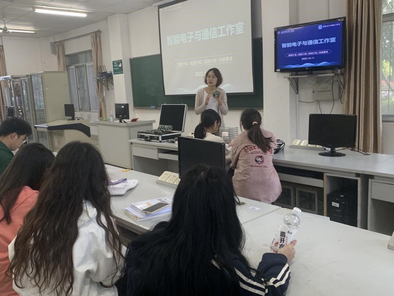 会议开始之初,老师们带领新成员对位于信息工程楼的工作室办公场所进行了参观,介绍工作室现有环境,表达了对新成员的热烈欢迎。随后,梁梦凡老师向新成员介绍了工作室各位指导老师的业务方向和现有项目情况,同时也展示了工作室的部分设备和技术,和前几届学生制作出的一些项目设备原型,包含智能停车场、灯光秀作品、环境检测系统等,展示出了工作室强大的实力。最后,肯定了新成员对智能电子与通信工作室的选择,向所有成员介绍了工作室的使命和愿景,期待大家一起携手共进。