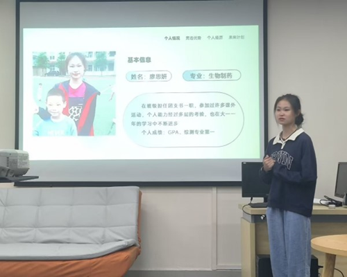 首先,候选人廖思妍同学从个人情况、竞选优势、个人经历和未来发展四个部分介绍自己的竞选优势。她表示,自己的GPA和综测是专业第一,参加过许多英语比赛,在文献的阅读方面有足够的优势,在对工作室的未来规划中,她将创新工作室的招新宣传方式以及文献分享会的形式,让更多的同学了解白衣工作室,让文献分享会的气氛更活跃。
