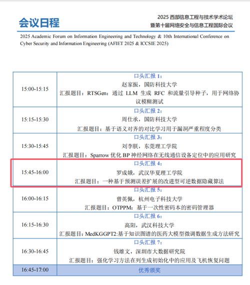 2025年7月23日智慧教育工作室老师罗成娥老师参加2025西部信息工程与技术学术论坛暨第十届网络安全与信息工程国际会议(ICCSIE 2025),会议在青海西宁召开,采用线上线下同步进行的方式。本届会议由北京工业大学、青海理工学院主办,浙江工业大学协办,并获得IEEE计算机协会技术联合赞助支持。青海理工学院计算机与信息科学学院院长谢永教授、浙江工业大学孔祥杰教授、青海大学张小丹教授等出席本次会议。