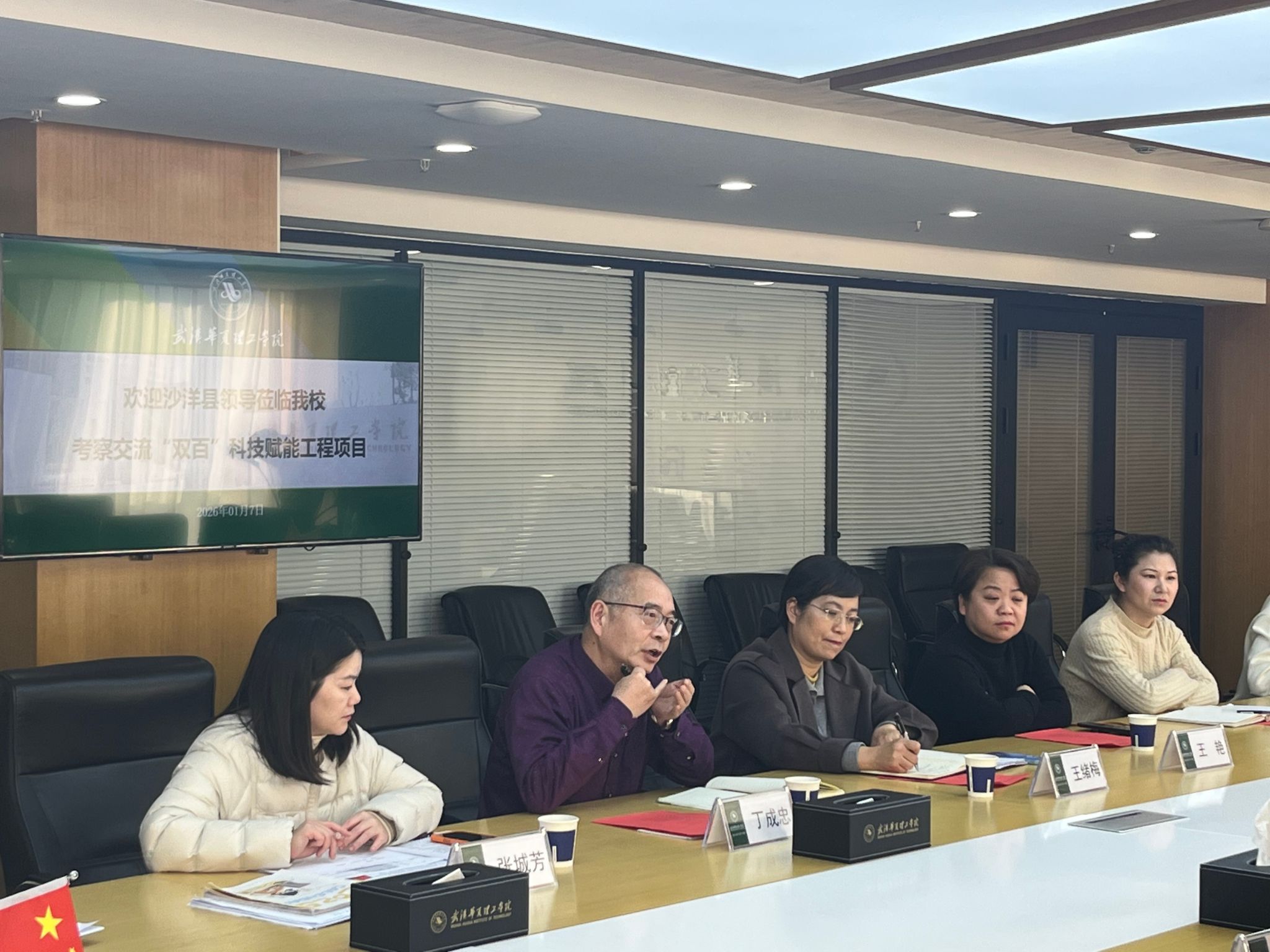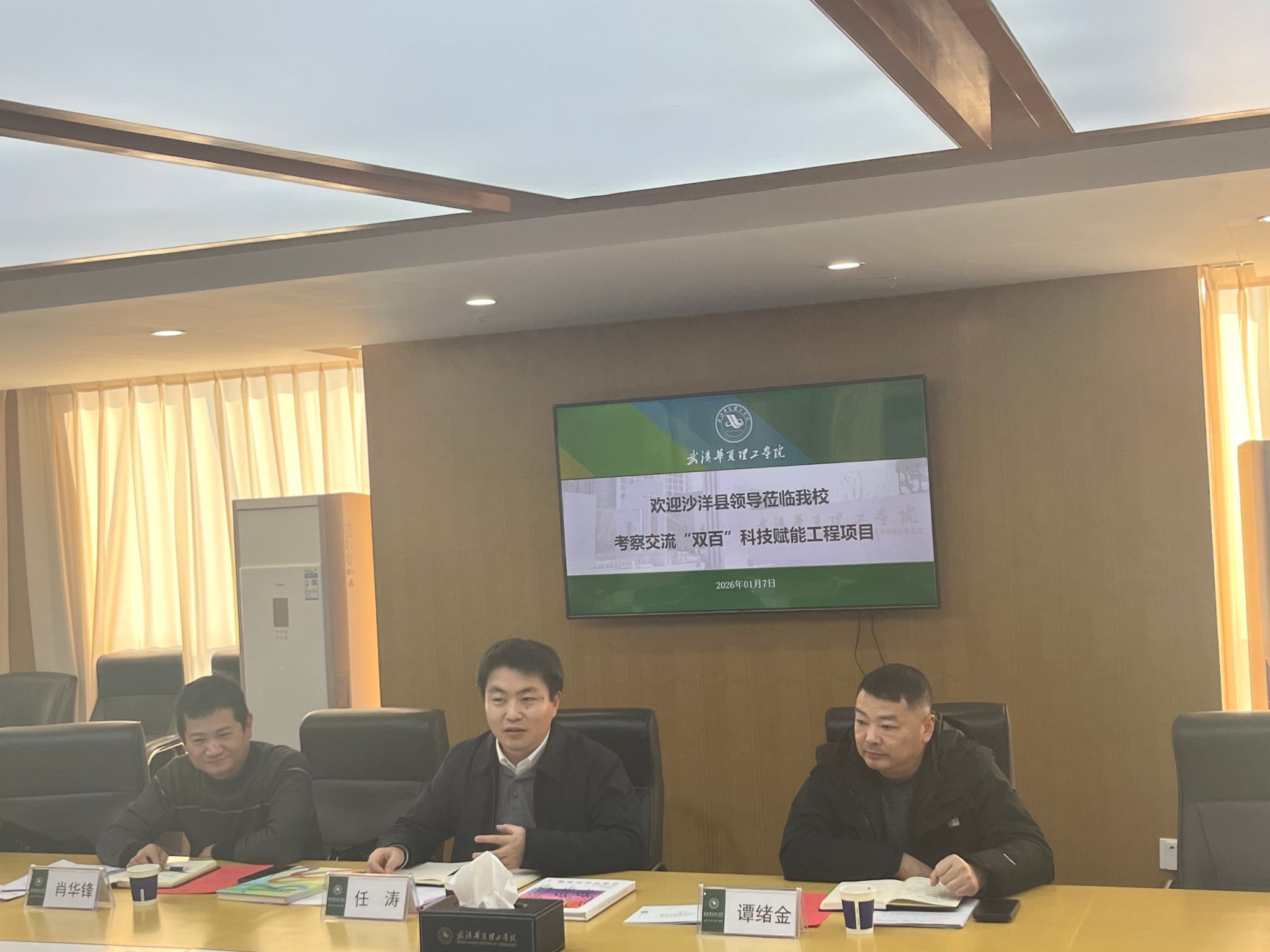 为贯彻落实湖北省 “双百” 科技赋能工程部署要求,搭建校地合作桥梁,推动产学研深度融合,2026 年 1 月 7 日下午,沙洋县领导来访我校,在综合楼 1402 会议室隆重召开校地合作对接与产业融合发展交流会。沙洋县人民政府副县长任涛、科经局局长肖华锋、副局长谭绪金等县领导一行,副校长丁成忠,科研部部长张城芳、科研管理办公室主任戴伟及相关二级学院副院长等出席会议,会议由丁成忠主持。