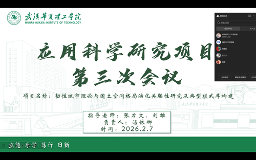 2026年2月7日,应用科学研究项目韧性城市理论与国土空间格局演化关联性研究及典型模式库构建第三次组会于线上顺利举行。本次会议由土木建筑工程学院城乡规划系23级同学汤依娜主持,华夏建规工作室指导老师刘雄、张力文以及23级同学刘轶婷、24级傅晨阳共同参与。组会以“项目研究个人成果汇报”为主题,小组成员明晰了任务目标,商议了后续研究框架,指导老师了解了项目进度。