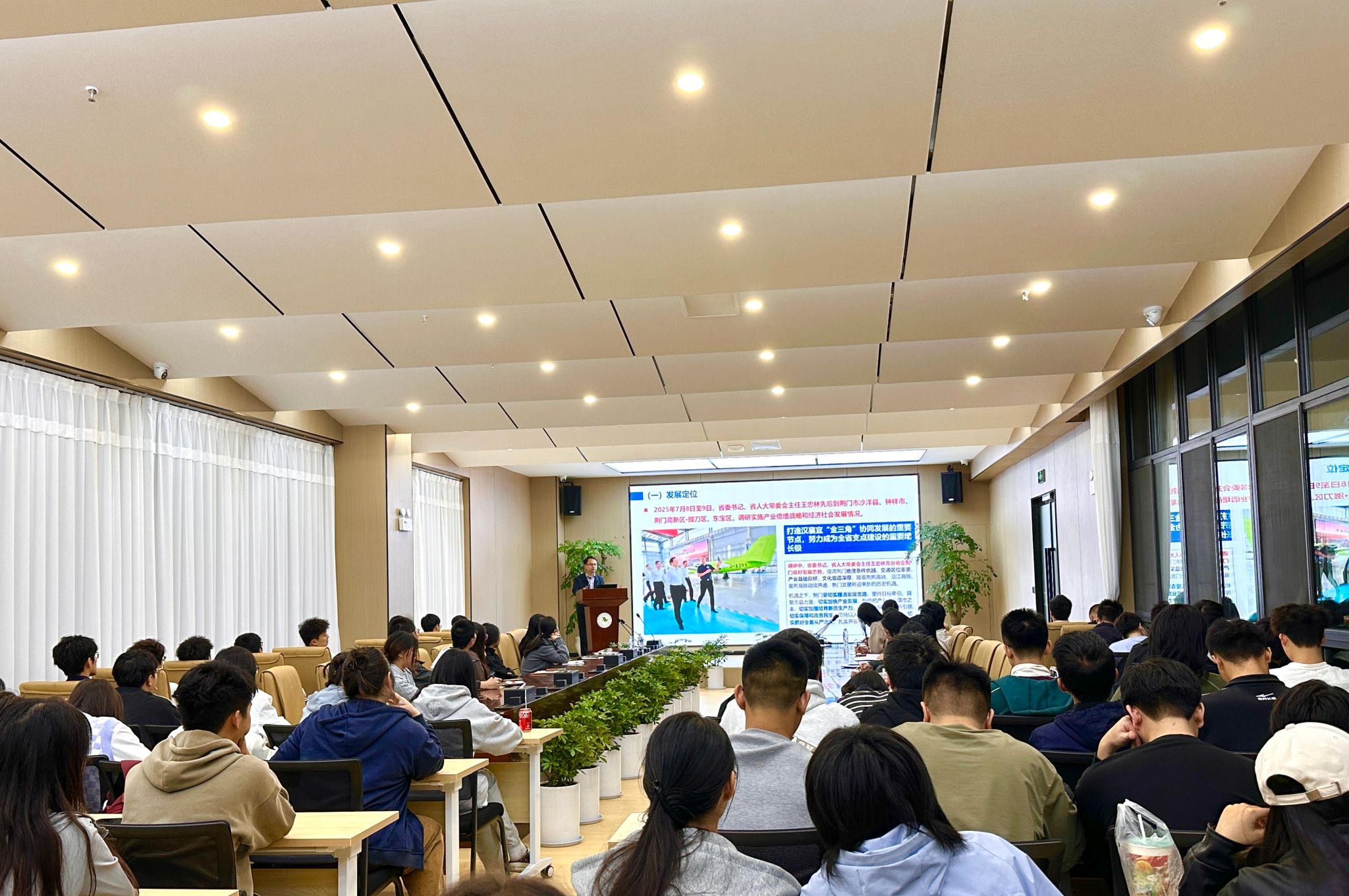 2025年11月5日,产教融合通识沙龙第22期于武汉华夏理工学院光谷校区多功能报告厅顺利举行。本次活动由土木建筑工程学院城乡规划系副主任杨喧主持,科研部部长张城芳、城乡规划专业责任教授密新武、城乡规划系主任张力文、骨干教师郝翠丽、胡琳、贾潞娟、汪思梦、华夏建规工作室指导老师向添媛以及六十余名学生共同参与。论坛以“湖北省地方‘十五五’发展规划思路与重点”为主题,特邀嘉宾湖北省战略规划中心审核处负责人,正高级工程师陶荣处长为师生带来了一场关于“十五五”背景下地方发展规划的专业讲座。