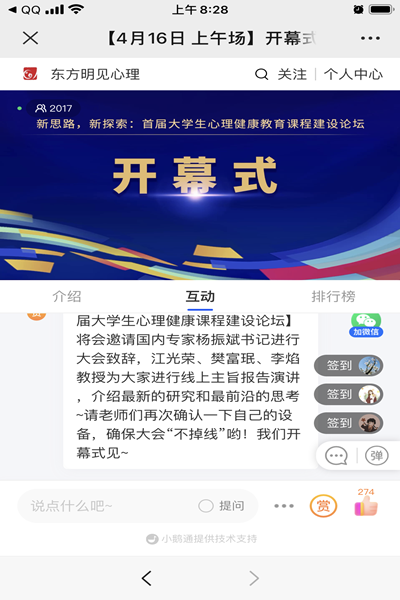 接下来进行主旨报告部分,老师们认真学习了江光荣教授《心理健康教育课程的基本目标》、樊富珉教授《基于积极心理学的大学生心理健康课:效果及影响因素研究》和李焰教授《大学生性心理健康课程建设的探索和思考——以清华大学为例》的线上讲座。接下来的一天半分别是各位心理健康教育专家和行业人士的研究专题报告和教学示范课的说课展示。4月17日下午17:10,华中师范大学心理健康教育中心主任吴才智教授宣布这次线上论坛顺利闭幕。