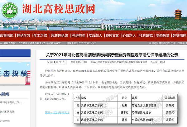 近日,湖北省高校思政课教学展示暨优秀课程观摩活动评选结果公布,我院赵萌老师的《马克思主义基本原理》、夏欣老师的《中国近现代史纲要》、杨丰铭老师的《思想道德与法治》等三门课程获得三等奖。此次评选由省教育厅组织专家对参赛教师的课件、教案和说课视频进行严格评选。我院三位教师获奖,是对我校思政教学质量的肯定,体现了我院“抓教学、抓质量”的成果。同时我们也看到,学院的教学质量还有提高的空间,学院全体老师将以此为契机,狠抓教学质量,提高教学水平,向建设省内一流思政课迈进。