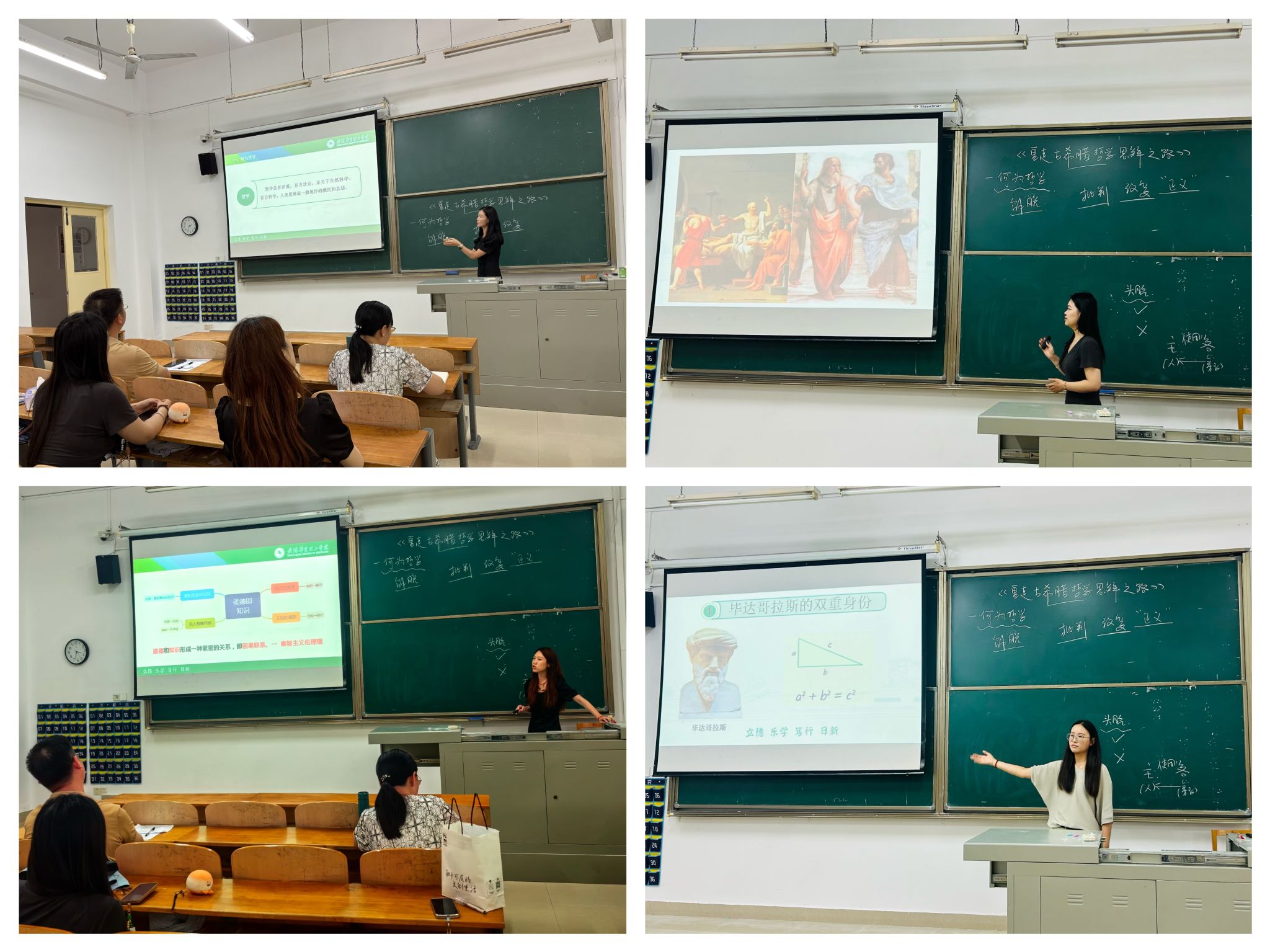 四位试讲教师凭借扎实的理论功底进行了课程讲授。课程内容从“何为哲学”的基本问题展开,依次解析了毕达哥拉斯“数是万物本原”的观点、苏格拉底“美德即知识”的伦理命题,以及柏拉图理念论的系统性哲学体系,呈现了古希腊哲学思想的思辨魅力。