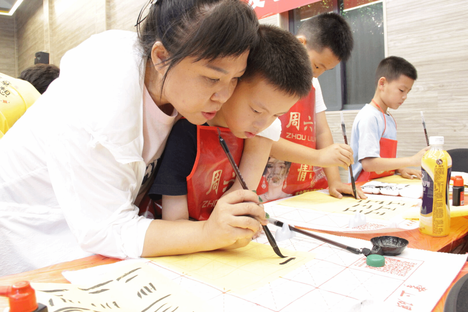 孩子们个个热情高涨,全神贯注地模仿着小助教老师们的动作,稚嫩的小手像攥着宝贝似的,紧紧攥着毛笔,指节因用力微微发白。小老师们穿梭在教室中,对孩子们进行一对一的指导,及时给予鼓励和纠正。