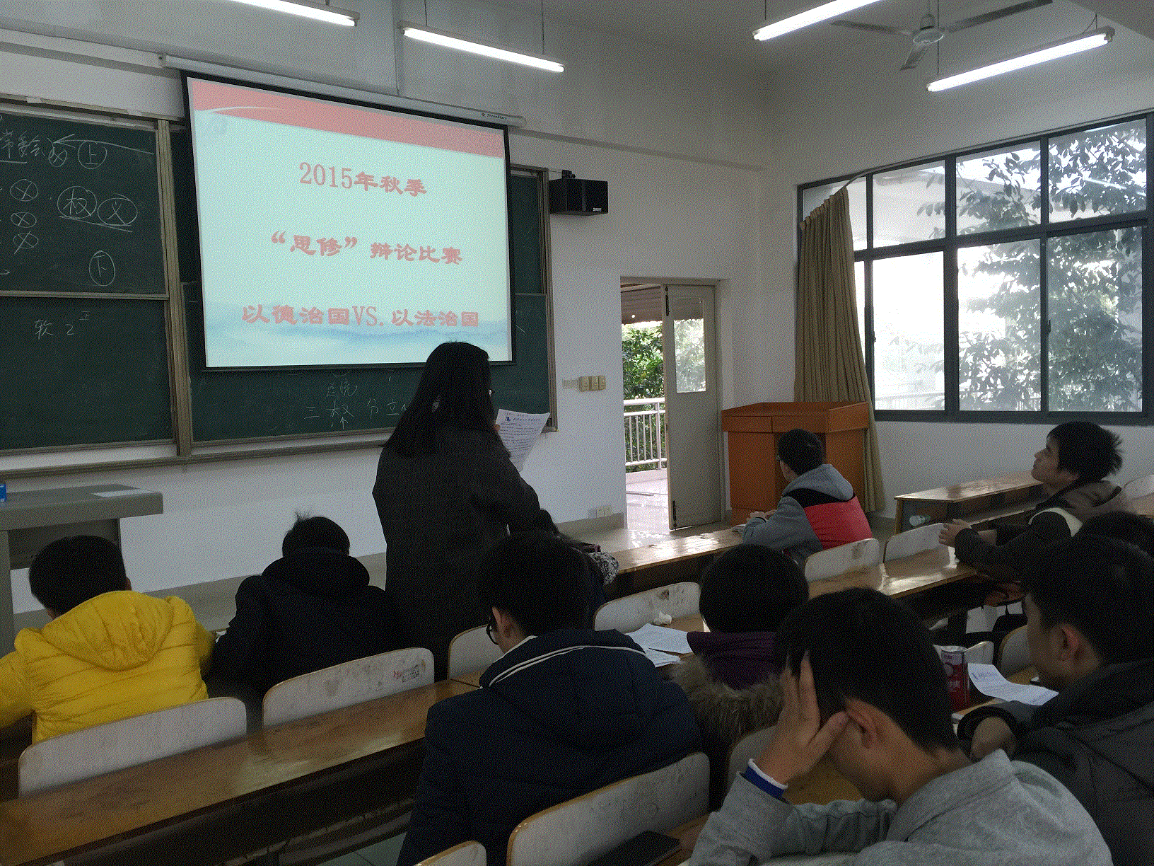 12月3日下午,2015级新生软件,计算机,测控5个班级在“思修”课堂上,展开了一场精彩的辩论。在双方简洁的自我介绍后,比赛正式开始。双方就当今中国“以德治国VS.依法治国"更胜一筹的问题展开辩论。双方选手唇枪舌剑,各抒己见,赛场气氛活跃,选手们精彩的陈词也博得观众阵阵喝彩。在自由辩论环节中,双方同学个个妙语连珠、舌绽莲花一次次把辩论比赛推向高潮。本次辩论赛不仅为学生提供了一个展示自我的平台,同时也为学生更好的理解课程内容打下了基础。