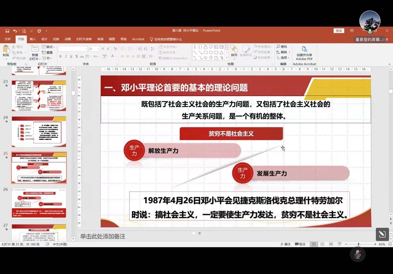 为深入贯彻落实新时代思政课建设要求,推动思想政治理论课高质量发展,马克思主义学院于9月29日19:00通过线上平台召开《毛泽东思想和中国特色社会主义理论体系概论》课程集体备课会。本次备课会聚焦第五章“中国特色社会主义理论体系的形成发展”、第六章“邓小平理论”,通过教师说课展示、专家精准点评、集体研讨优化等环节,为提升课程教学质量注入新动能。会议由习近平新时代中国特色社会主义思想概论教研室主任程权明主持,教授杜伦芳、副教授盛蕾等专家及教研室十余名教师参与研讨。