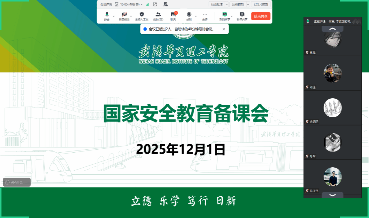 为进一步提升课程教学质量,凝聚教学共识,12月1日,《国家安全教育》课程组通过腾讯会议召开第二次集体备课会,承担该课程教学任务的全体教师参加了会议。