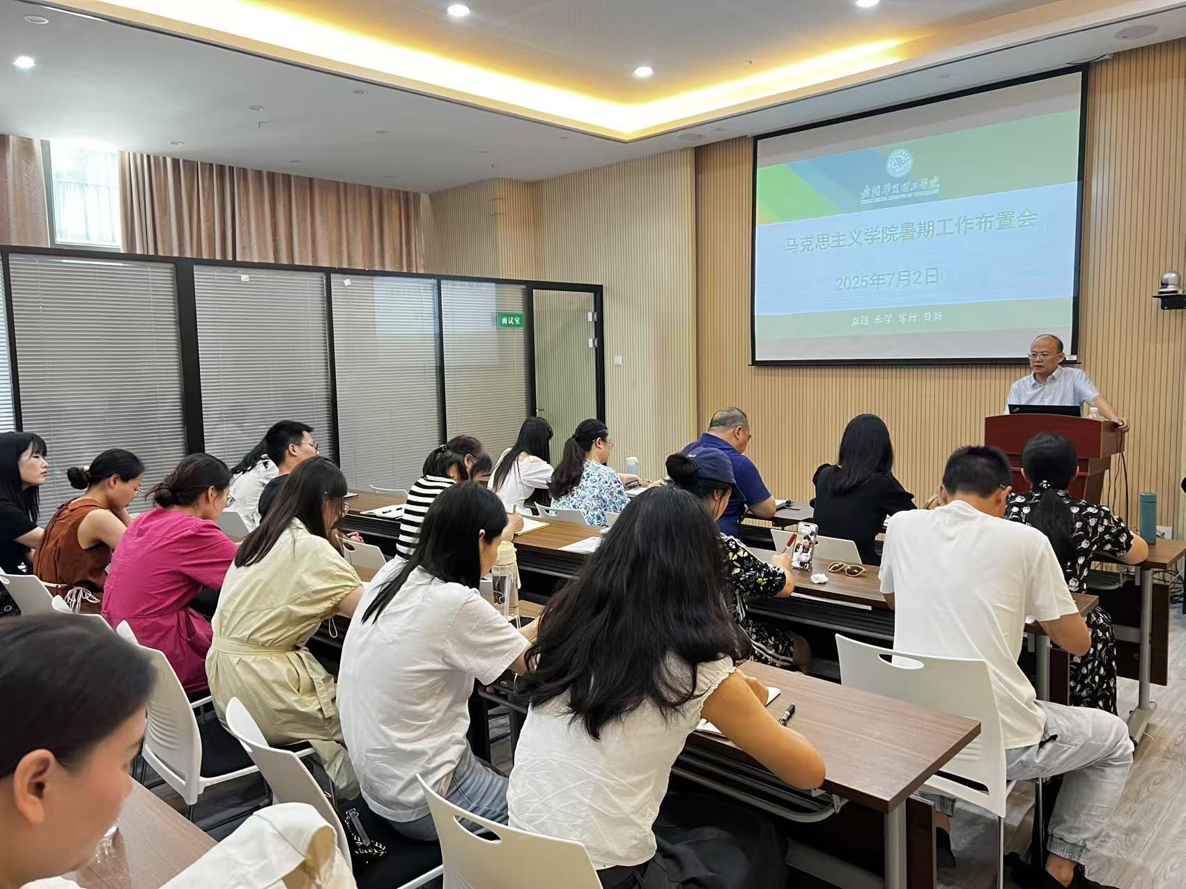 为扎实推进教育部本科教学工作评估迎评工作,统筹规划暑期重点任务,7月2日下午两点,马克思主义学院在综合楼远程招聘厅召开暑期工作会议。会议由院长陈波主持,学院领导班子及全体教师参加会议。